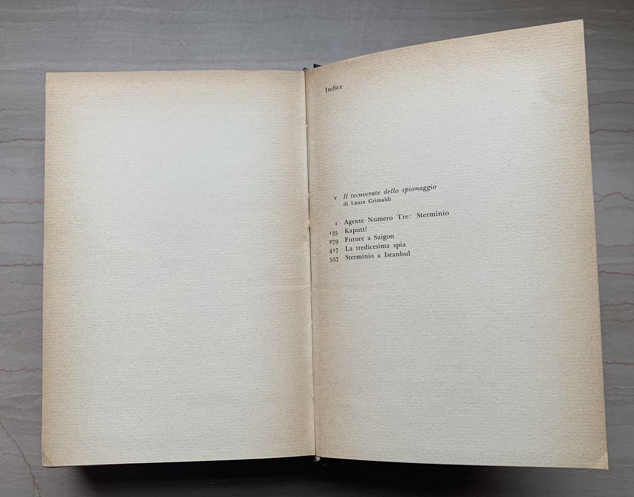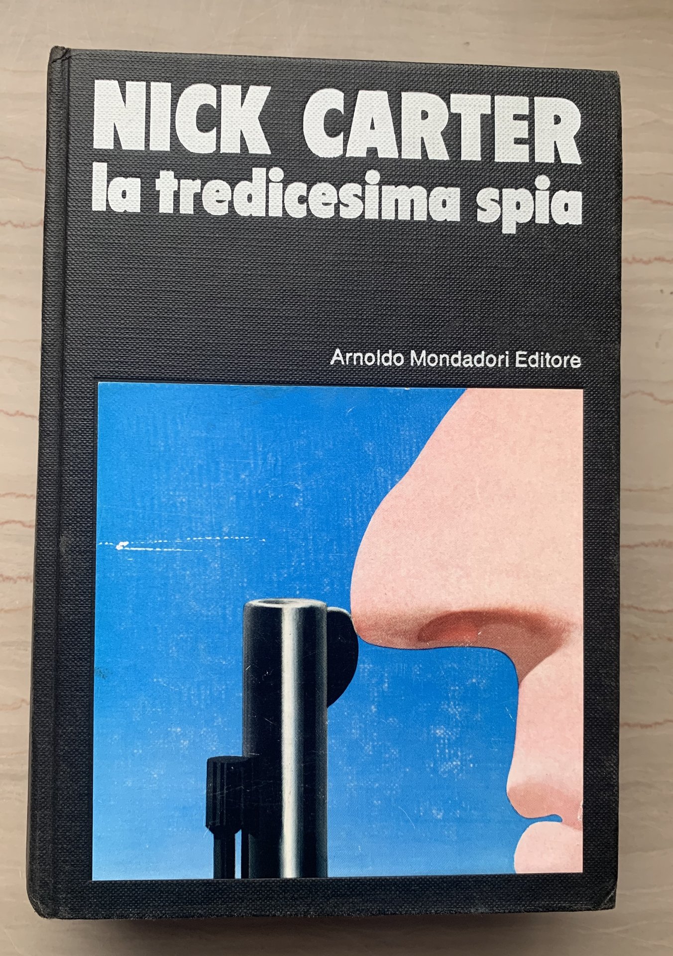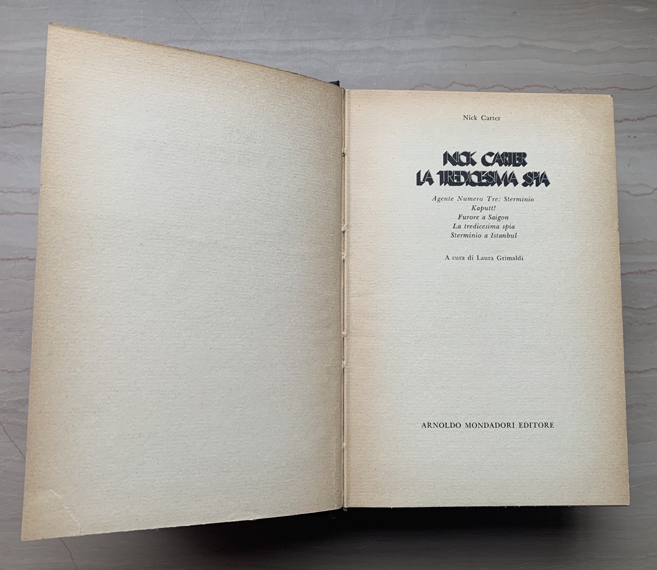 © Arnoldo Mondadori Editore 1972 per l'opera in raccolta. I edizione Omnibus Gialli: maggio 1972 (11171 - OMN). A cura di Laura Grimaldi. Agente Numero Tre: Sterminio (titolo dell'opera originale: Run, Spy Run. Di Michael Avallone e Valerie Moolman, Conde Nast Publications Inc. 1964. Traduzione di Dina Corrada Uccelli) - Kaputt! (Titolo dell'opera originale: Fräulein Spy. Di Valerie Moolman, Universal Publishing and Distributing Corporation 1964. Traduzione di Moma Carones) - Furore a Saigon (Titolo dell'opera originale: Saigon. Di Michael Avallone e Valerie Moolman, Universal Publishing and Distributing Corporation 1964. Traduzione di Luciana Agnoli Zucchini) - La tredicesima spia (Titolo dell'opera originale: The 13th Spy. Di Valerie Moolman, Universal Publishing and Distributing Corporation 1965. Traduzione di Moma Carones) - Sterminio a Istanbul (Titolo dell'opera originale: Istanbul. Di Manning Lee Stokes, Universal Publishing and Distributing Corporation 1965. Traduzione di Moma Carones). VIII/VIII+700=708/rilegatura in tela nera con titoli in bianco e illustrazione a colori applicata al primo piatto. Risguardi illustrati in bianco/rosso. Copertina e risguardi di Feren Pintér. Stato buono (manca la sovraccoperta - leggera usura della copertina - risguardi e pagine bruniti e con qualche fioritura - firma di possesso datata a penna rossa a p. I, non stampata).