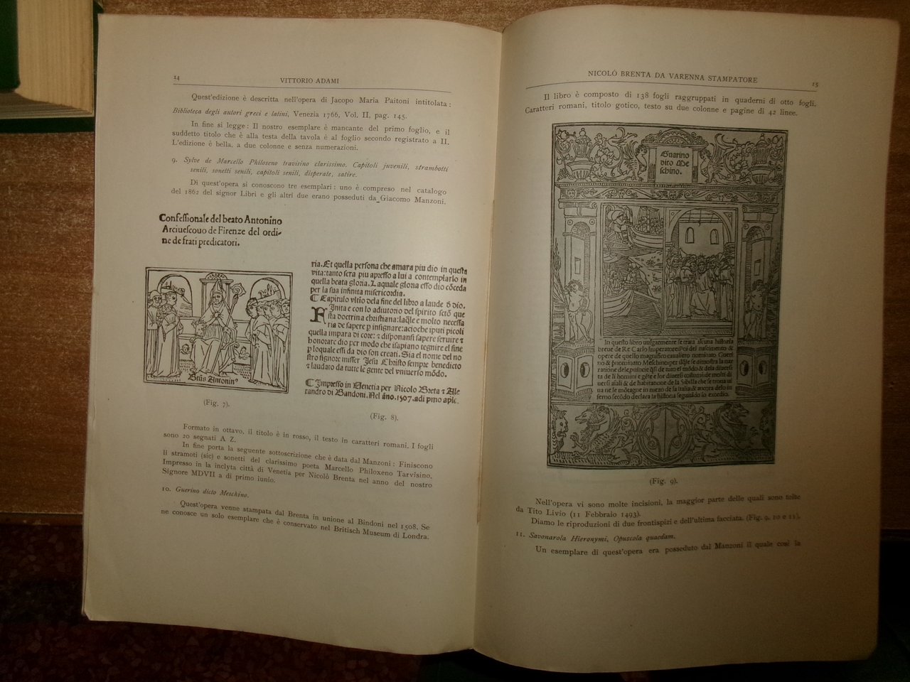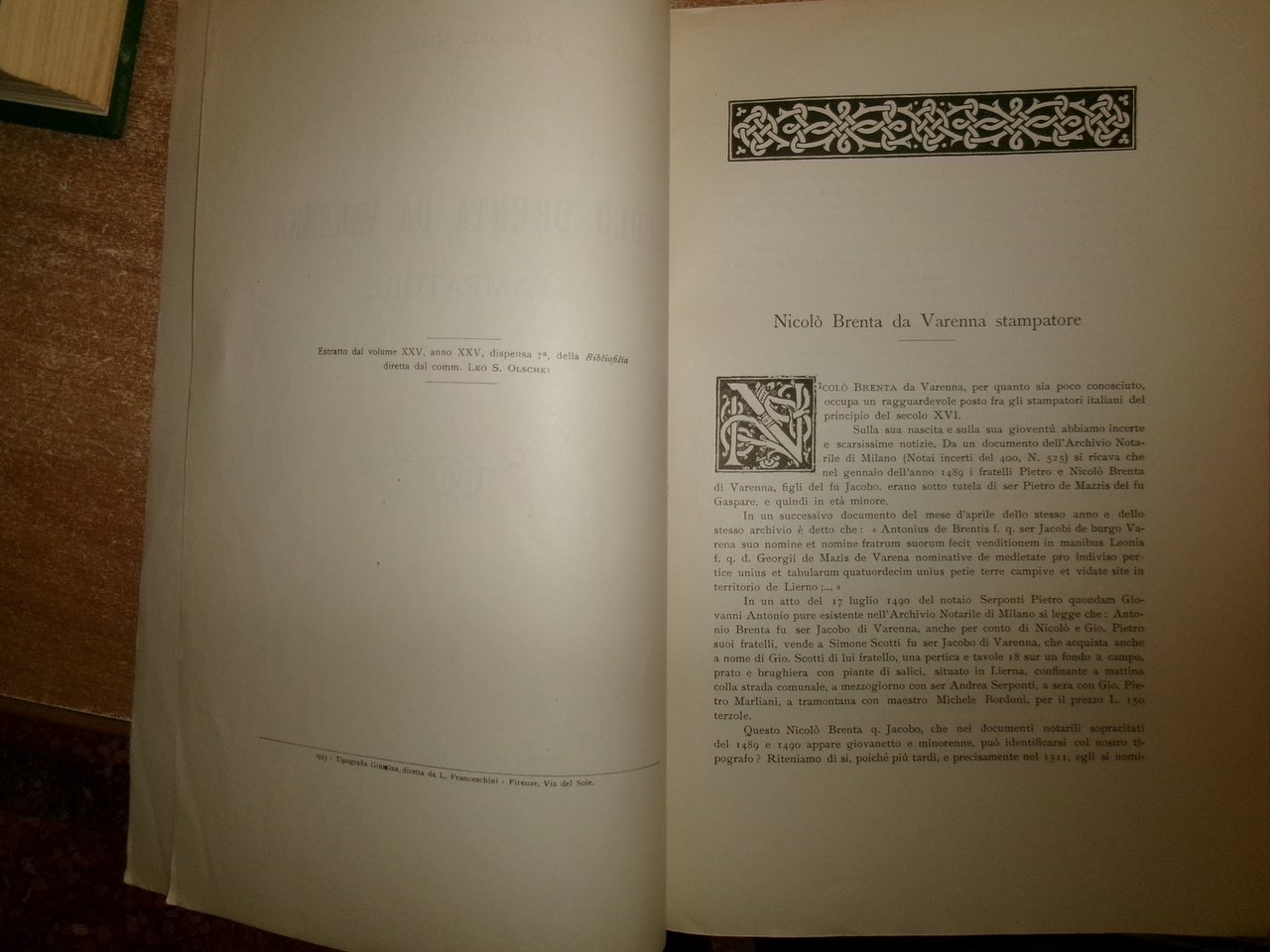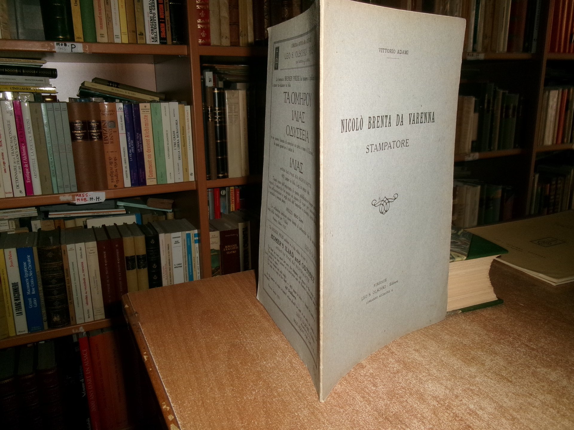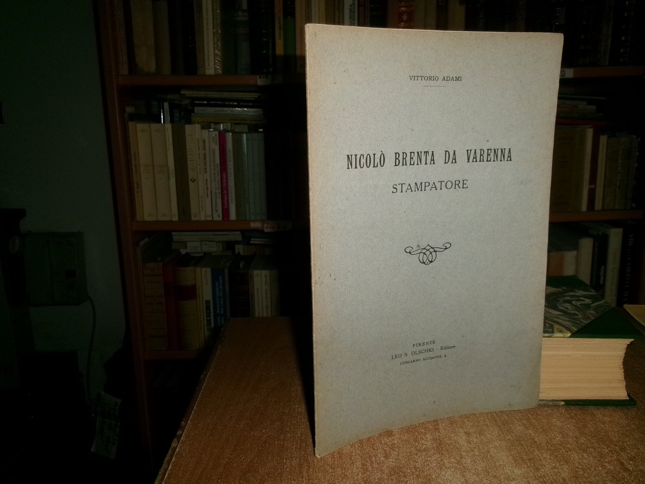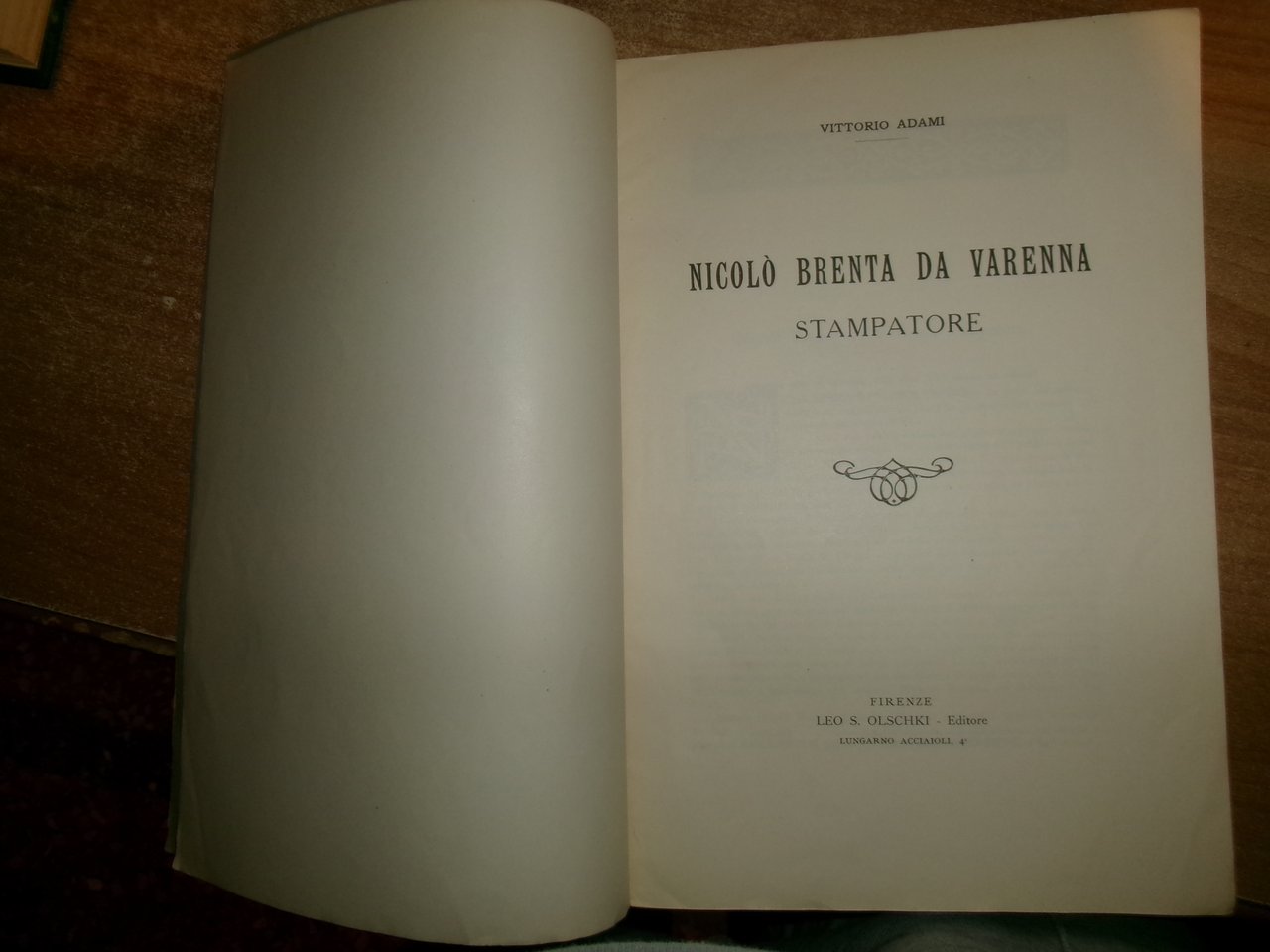 VITTORIO ADAMI. Firenze, Leo S. Olschki Editore, 1923. Nicolò Brenta da Varenna Stampatore. In-8° grande, br. orig. 17 pp. con alcuni facsimili nel testo. Opuscolo in ottimo stato parzialmente intonso. Neg. mob. 16 entro busta trasp.