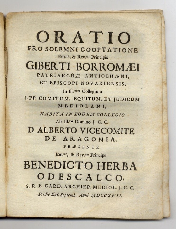 In Milano, per Pietro Francesco Nava stampatore del detto insigne collegio, 1718 in-4, cartonatura marmorizzata (dorso rinforzato), pp. 80, [2]. Non è stata legata l'ultima carta che era bianca (cfr. descr. in ICCU). A c. I1r front. con tit. proprio: Oratio pro solemni cooptatione em.ni [.] Giberti [sic] Borromaeii [.]. Qualche camminamento di tarlo interlinea (poche lettere toccate).