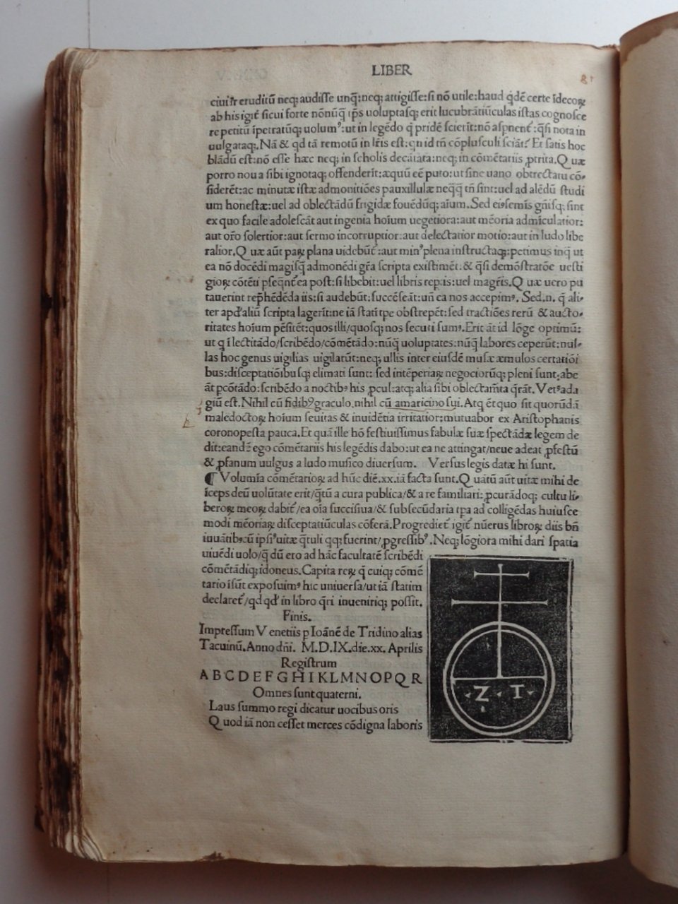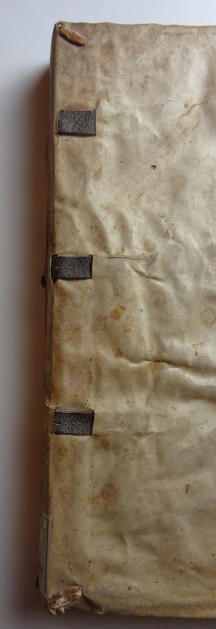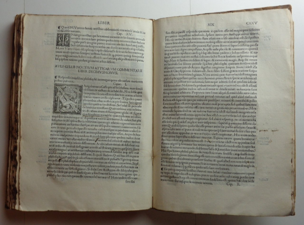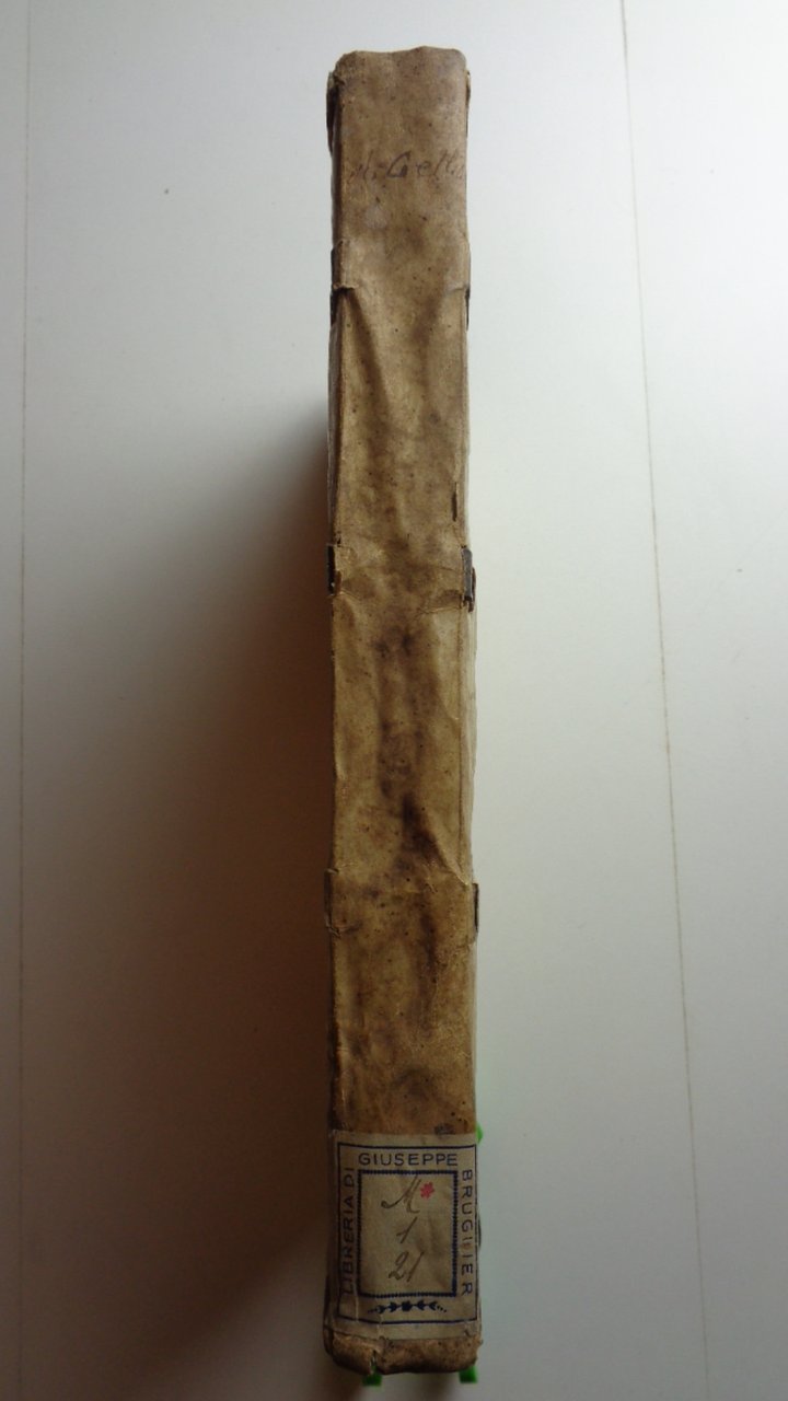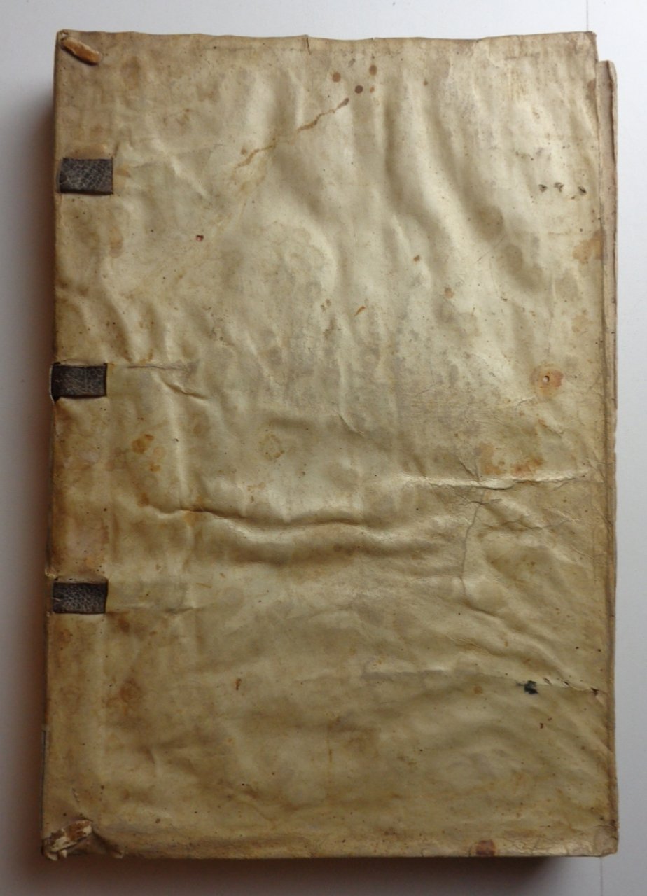 Un volume in 4° di (36)-CXXXV pagine (+1 foglio bianco). Titolo in rosso e nero con grande marca tipografica al centro (gore evidenti). Pag. I in rosso e nero, con grande figura xilografica. Capilettera incisi. Legatura in piena pergamena morbida (con numerose macchie); strisce di pelle ai nervi, esempio di legatura "da studio" dei primi del Cinquecento. Tracce di inchiostro ai tagli. Un po' rifilato in testa, l'esemplare conserva tutta la sua larghezza: nei margini bianchi note di mano dell'epoca, qualche sottolineatura.