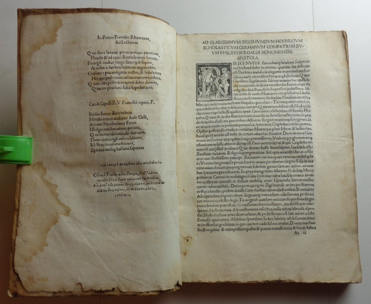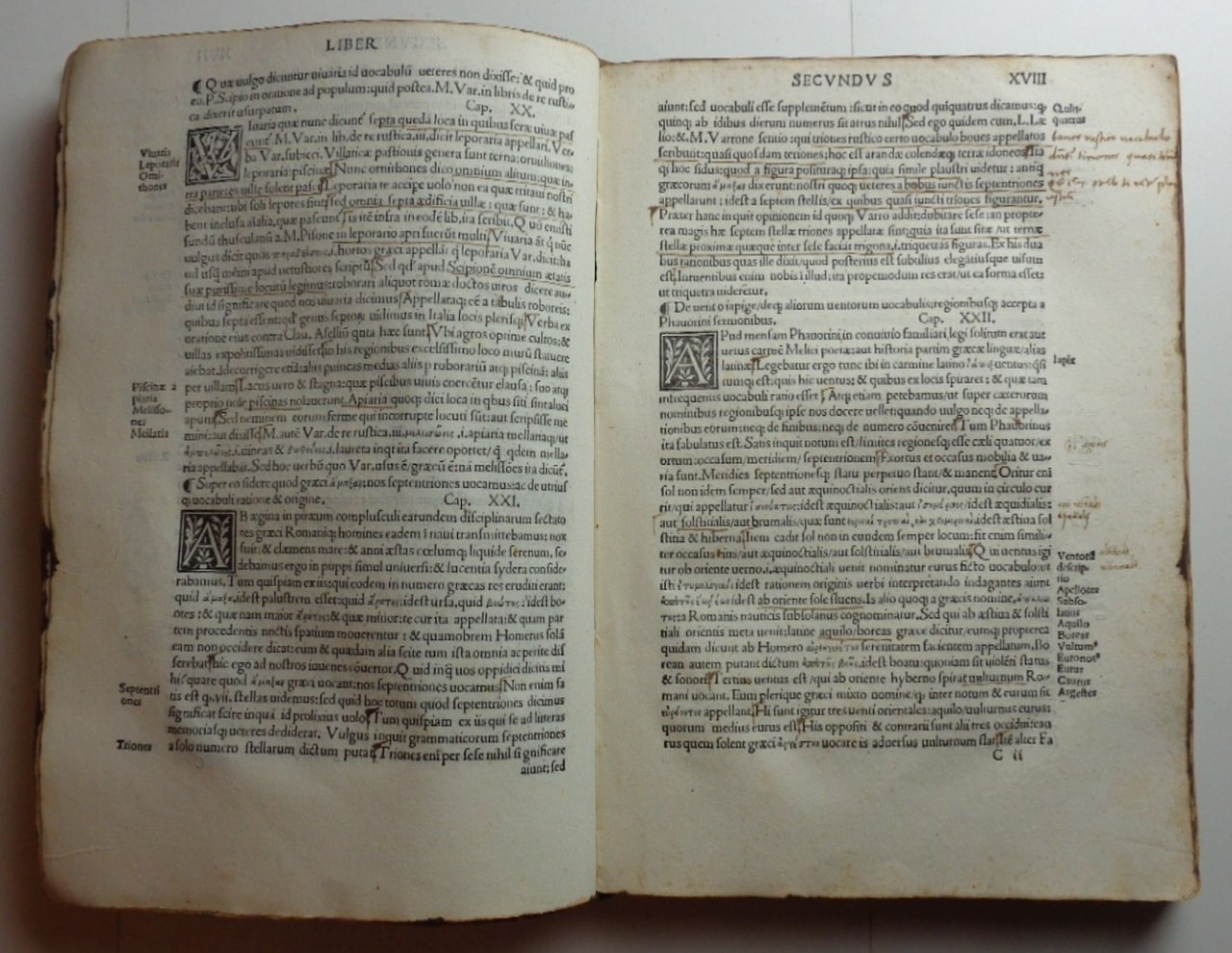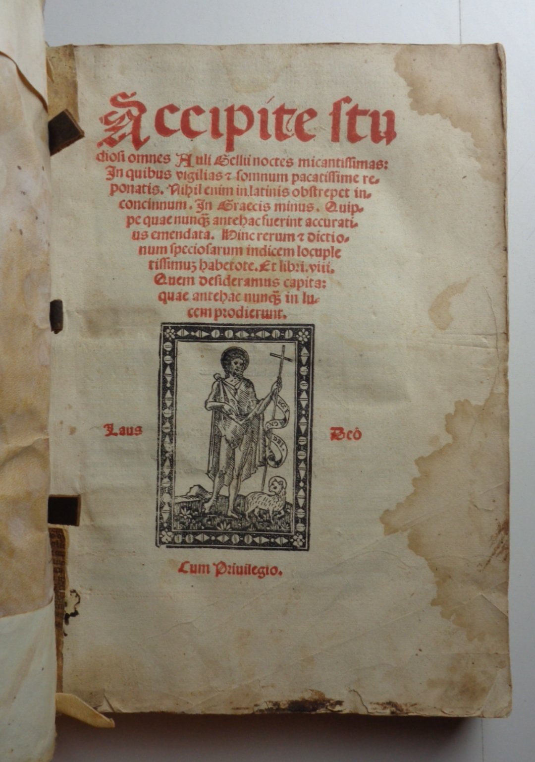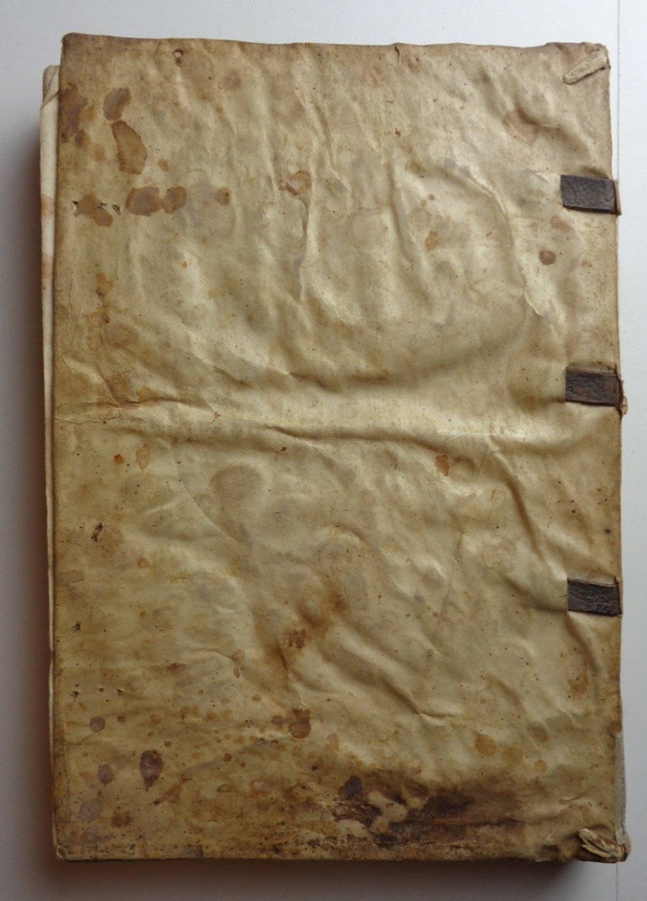 Un volume in 4° di (36)-CXXXV pagine (+1 foglio bianco). Titolo in rosso e nero con grande marca tipografica al centro (gore evidenti). Pag. I in rosso e nero, con grande figura xilografica. Capilettera incisi. Legatura in piena pergamena morbida (con numerose macchie); strisce di pelle ai nervi, esempio di legatura "da studio" dei primi del Cinquecento. Tracce di inchiostro ai tagli. Un po' rifilato in testa, l'esemplare conserva tutta la sua larghezza: nei margini bianchi note di mano dell'epoca, qualche sottolineatura.