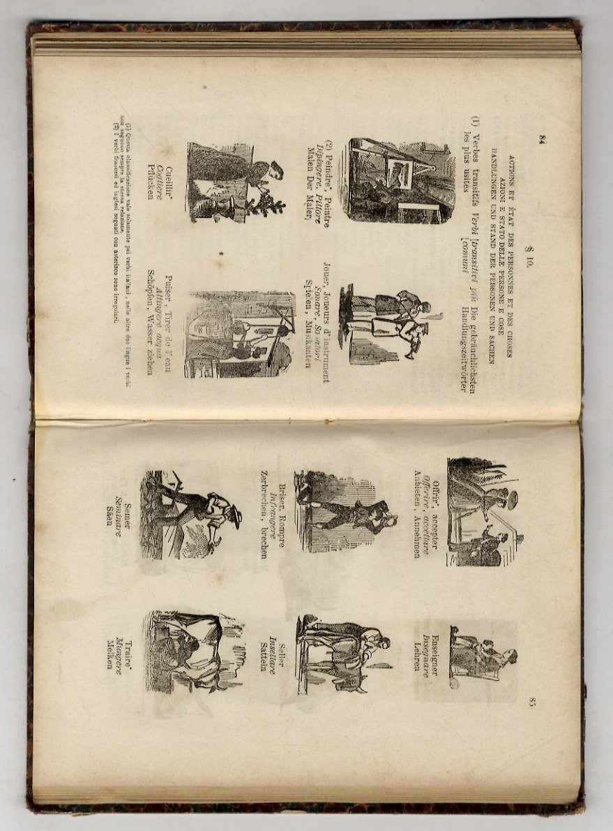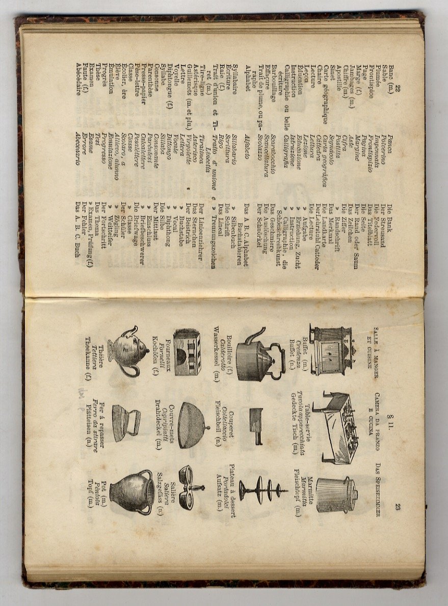 Nomenclatura figurata in francese, italiano e tedesco. Seguita da 40 dialoghi familiari, alcuni dei quali tradotti dalle commedie del celebre Molière. Ornata di 495 figure.
