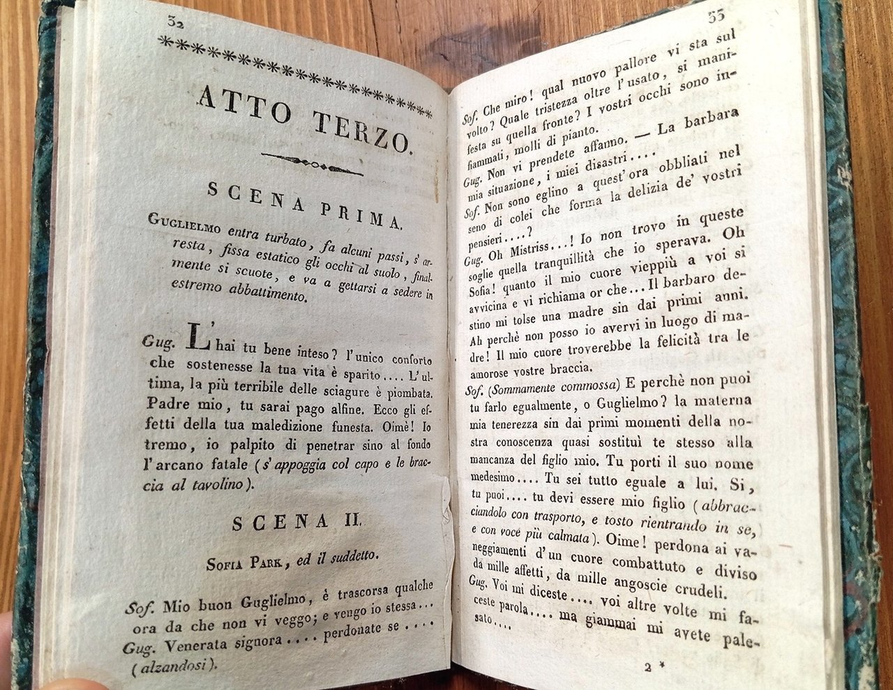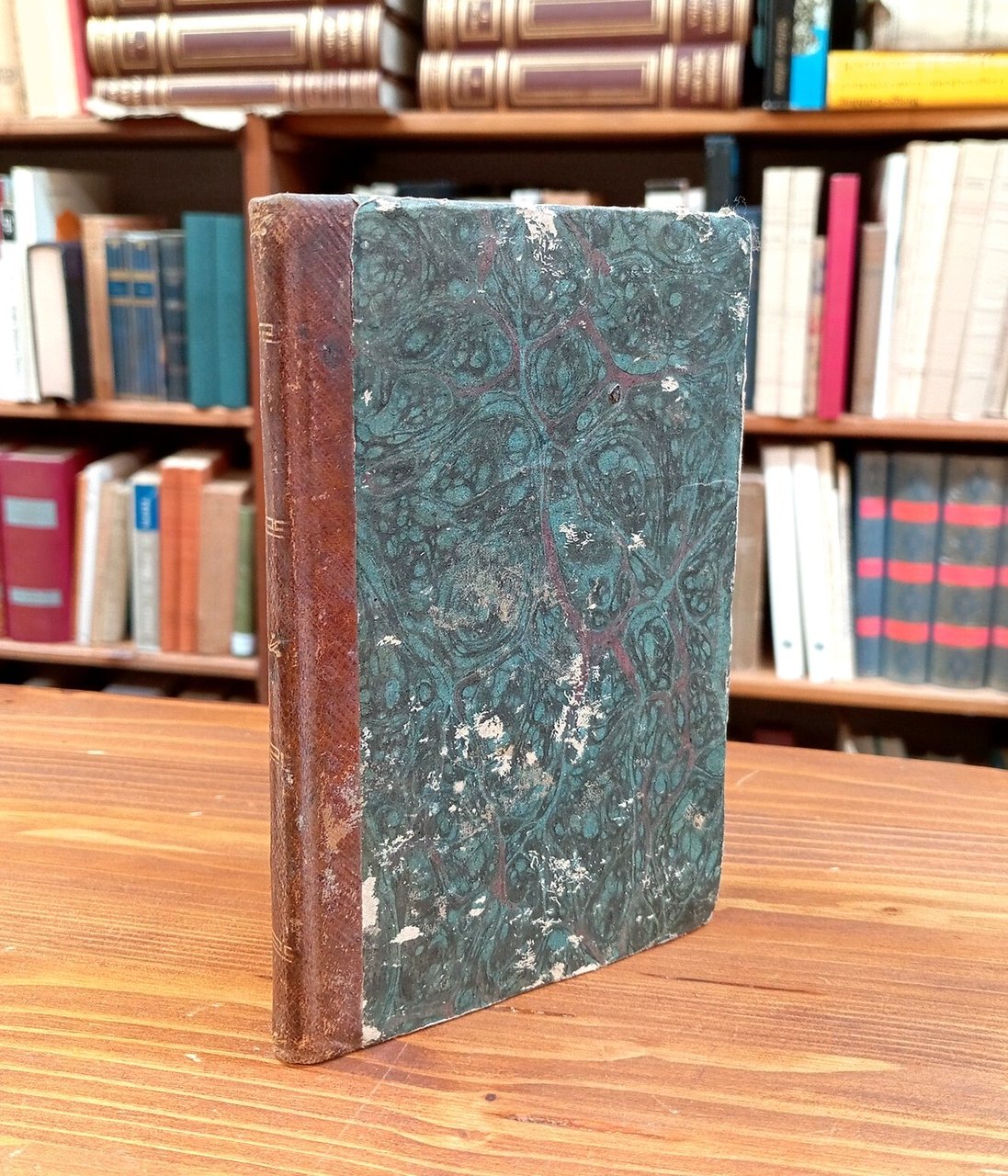 Volume rilegato in mezza pelle con filetti in oro al dorso, 72 pagine; all'antiporta una tavola illustrata colorata a mano. Informazioni editoriali desunte dall'OPAC, in quanto risulta mancante la pagina di frontespizio; al suo posto una nota calligrafica che riporta come titolo "La moglie non si deve affidare a niuno. Comedia in cinque atti"; manca anche il foglio di guardia posteriore. Ordinari segni d'uso e del tempo a parte, l'esemplare risulta ben conservato; libricino non comune, censito solo in un paio di biblioteche nazionali.