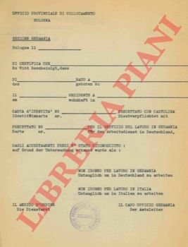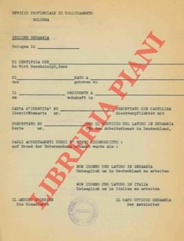 Bologna, dattiloscritto con timbro italiano, in italiano e tedesco, non compilato. Certamente avuto per uso della Resistenza bolognese.
