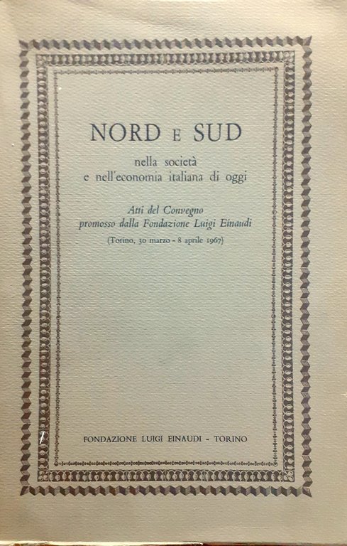 I ed., collezione "Studi", vol. 1. Atti del Convegno promosso dalla Fondazione Luigi Einaudi (Torino, 30 marzo - 8 aprile 1967): 229 partecipanti circa (dall'elenco, con gli indirizzi). In-8, pp. 544+2 promozionali della Fondazione, brossura con titoli in marrone scuro al primo piatto e al dorso (al primo piatto i titoli sono entro cornice ornata). Stato buono Indice: Premessa; Il Comitato Scientifico della Fondazione Luigi Einaudi - Partecipanti - Giovedì 30 marzo 1967 (Apertura dei Lavori (Luigi Firpo - Mario Allara - Luigi Firpo) - Il Mezzogiorno nell'economia italiana degli ultimi anni; relazione di Augusto Graziani - Interventi di AA.VV.) - Venerdì 31 marzo 1967 (Vecchi e nuovi orientamenti del pensiero meridionalistico; relazione di Giuseppe Galasso - Interventi di AA.VV.) - Sabato 1^ aprile 1967 (Il Mezzogiorno nel quadro dell'evoluzione demografica italiana; relazione di Giuseppe Galasso - Interventi di AA.VV.) - Lunedì 3 aprile 1967 (La politica per il Mezzogiorno: sue realizzazioni e sviluppi; rerlazione di Augusto Graziani - Interventi di AA.VV.) - Martedì 4 aprile 1967 (Ladistribuzione regionale nel quadro del MEC; relazione di Francesco Compagna - Interventi di AA.VV.) - Mercoledì 5 aprile 1967 (Il Mezzogiorno agricolo e il suo avvenire: "L'osso e la polpa"; relazione di Manlio Rossi Doria - Interventi di AA.VV.) - Giovedì 6 aprile 1967 (Il Mezzogiorno nel quadro dell'evoluzione del sistema urbano italiano; relazione di Francesco Compagna - Interventi di AA.VV.) - Giovedì 6 aprile 1967 (Problemi dell'insediamento dell'immigrazione meridionale a Torino e cintura - Dibattito) - Venerdì 7 aprile 1967 (Trasformazione agraria nel Mezzogiorno ed esodo rurale. Relazione di Manlio Rossi Doria - Interventi di AA.VV.) - Sabato 8 aprile 1967 (Nord e Sud nell'Italia di oggi e di domani; AA.VV.) - Indice.
