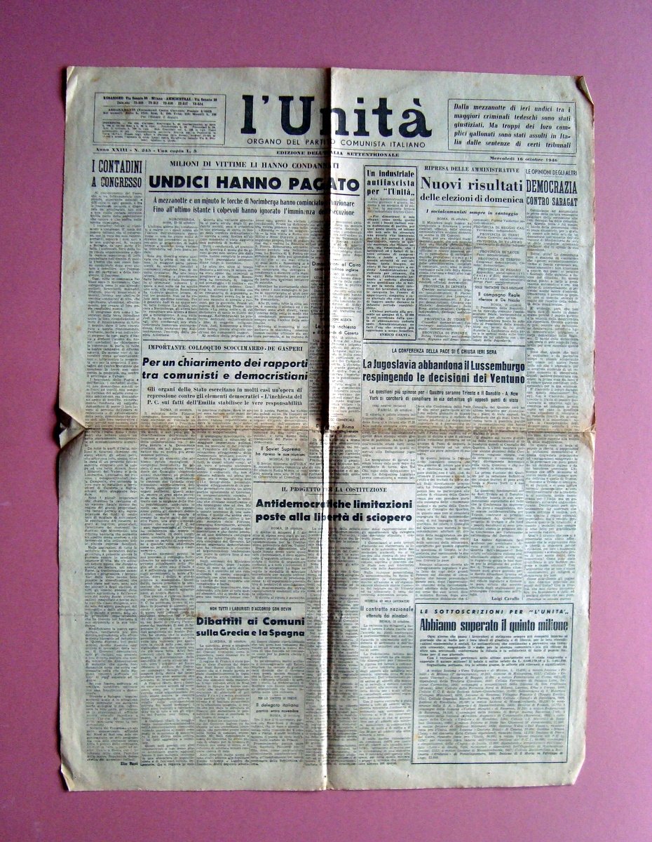 Periodico, L'Unità" Organo del Partito Comunista Italiano Anno XXIII - N. 245 16 ottobre 1946 in prima Undici hanno pagato Milano, 1946; cm 58,5x43, 2 facciate completo. Condizioni di conservazione Esemplare in discrete condizioni con tracce d'uso, pieghe di conservazione che si presentano ingiallite e con piccoli strappetti; margini con piccole macchiette e , pieghette e qualche minuscolo strappetto; per le condizioni vedi foto. Numero completo. .Norimberga.esecuzioni SC03.D19038 blu "