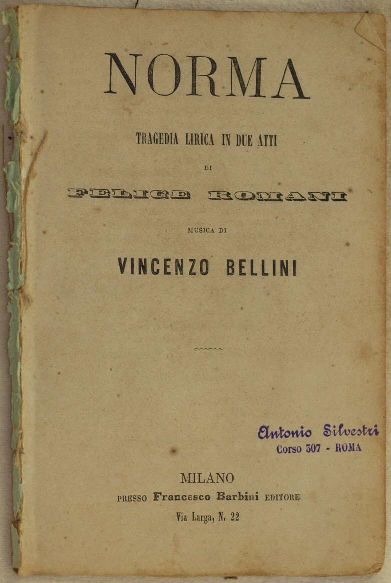 In 16. Dim. 16,5x11 cm. Pp. 35. Edizione senza data ma del 1870 del libretto d'opera Norma di Vincenzo Bellini. La prima rappresentazione avvenne il 26 dicembre 1831 in Teatro alla Scala di Milano. In buone condizioni. Copertina assente. Legatura in discrete condizioni. All'interno le pagine si presentano in discrete condizioni con rare fioriture. Edition of 1870's of this booklet Norma by the italian composer Vincenzo Bellini. The first representation was made the 26th of december 1831 in Teatro alla Scala of Milan. In good conditions. Cover is missing. Binding is almost missing. Inside pages are in good conditions with occasional foxings and missing parts.