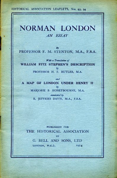 No marks or inscriptions to contents. Very minor creasing to rear cover. Clean tight pages in booklet form with slightly sunned boards, slight marking to rear, rusty staples and no bumping to corners. Large fold-out sketch map (21 x 31 inches) of London under Henry II at end is in excellent condition. 40pp. An account of the City of London from the time of the Conquest, when even then it stood alone above other English towns in wealth and power. Includes a translation of William Fitz Stephen's description of London. Historical Association Leaflets No 93 and 94.