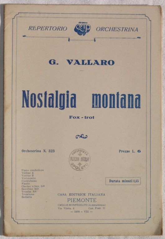 In 8. cm 26,5x18. Pp. 16. partitura completa per orchestra del 1930 di una canzone. Caratteristica copertina illustrata d'epoca. Ex libris sulla copertina. In ottime condizioni. a complete score for orchestra of 1930. Carachteristic decorated cover of that period. Ex libris in the cover. In very good conditions.