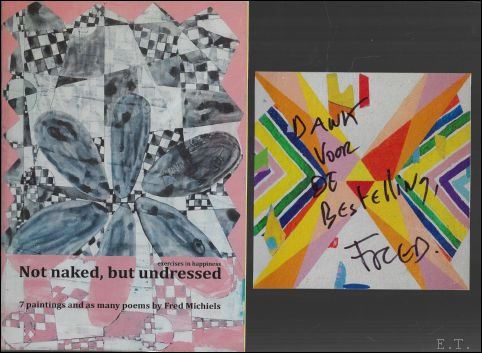 Softcover, pages not numbered, 24 x 17 cm, full colour. signed and numbered with thank you card, also signed. EN. *New. 'Not naked, but undressed' is Fred Michiels? third solo show at Eva Steynen Gallery. Those familiar with Michiels' work will know that his exhibitions are forever surprising, in both approach and form. This time around he is not only presenting a new series of paintings and works on paper, but also joyful new ceramics and transparent glass works that stand in the space and hang against or at odds with the wall? As always, Michiels also made a playful booklet for the occasion of his exhibition, assembling his 'surrealist' poems and pamphlets with a selection of recent works. Painter and poet Fred Michiels ( B 1966, lives and works in Sambreville) has fully dedicated himself to abstraction in all its propositions and forms. The artist continually creates new challenges for himself: he paints in order to create spaces of possibility. Visual information from a variety of sources, cultural references and abstract forms alike, intermingle in a cheerful way. His work is instinctive and unplanned; straightforward and free. The abstractions are never limiting, but rich in visual experiences. For almost 30 years and with a great sense of humour, Michiels has investigated the status of painting. In that endeavour, the early figurative aspects of his painting slowly disappeared, making way for form, colour, and painted matter. New since some years are his colorful ceramics and transparent glass objects.