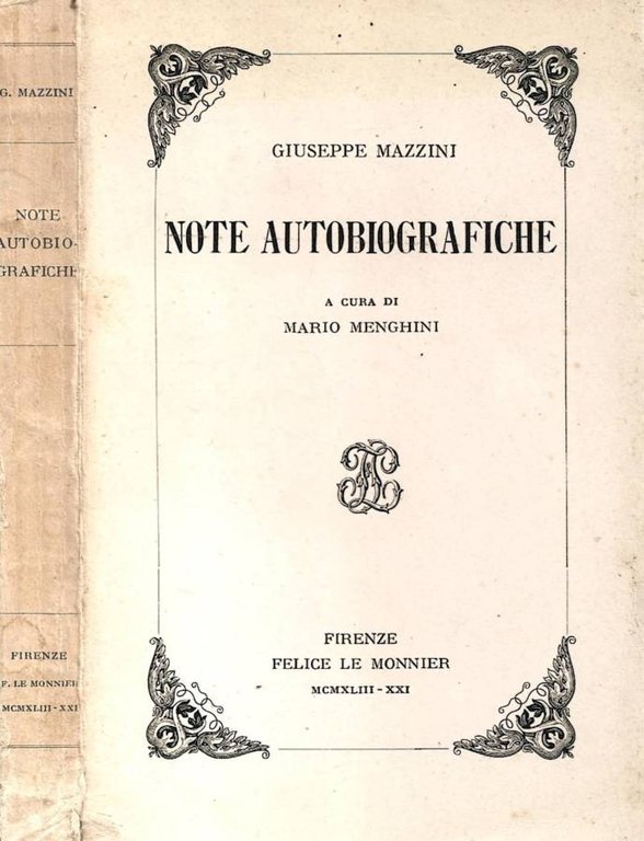 Note autobiografiche di Giuseppe Mazzini, a cura di Mario Menghini; brossura datata in cartoncino lacerato alle cuffie, pieghe al dorso brunito, fioritura e scuriture da polvere incorniciano i piatti, sgualciture lungo i bordi. Fogli rilegati filo refe, ancora intonsi, tonalità ossdiate vintage, addensamenti ai margini, bruniti i tagli irregolari, legatura abbastanza salda. N. pag. 369.