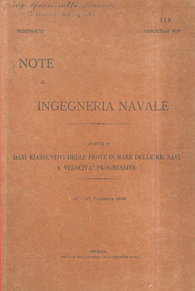 Spezia, Tipo-Lit. della Direzione delle Costruzioni Navali, 1904, in-4, cartonatura editoriale con il dorso in tela, per oltre 100 pp. non numerate. Contiene 112 prospetti da compilare, con nome della nave e varie velocità raggiunte (di cui 32 sono compilati a stampa, gli altri lasciati in bianco). Qualche macchia di vecchia umidità. Notazione di possesso manoscritta sulla copertina ant.: Sig. Giannelli Odoardo.