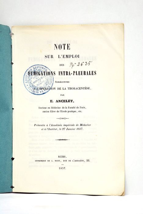 Note sur l'emploi des fumigations intra-pleurales consécutives à l'operation de la thorancentése. Présentée à l'Académie impériale de Médecinie et à l'Institut, le 27 janvier 1857.