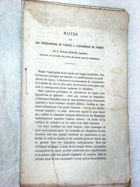 in-8. 42pp. (1f.blanc). Broché. Exemplaire non rogné. Mouillures. Rare impression de Saint-Etienne de cette brochure sur les différentes chaudières exposées à Vienne en 1873. Industrie. Rhône-Alpes.