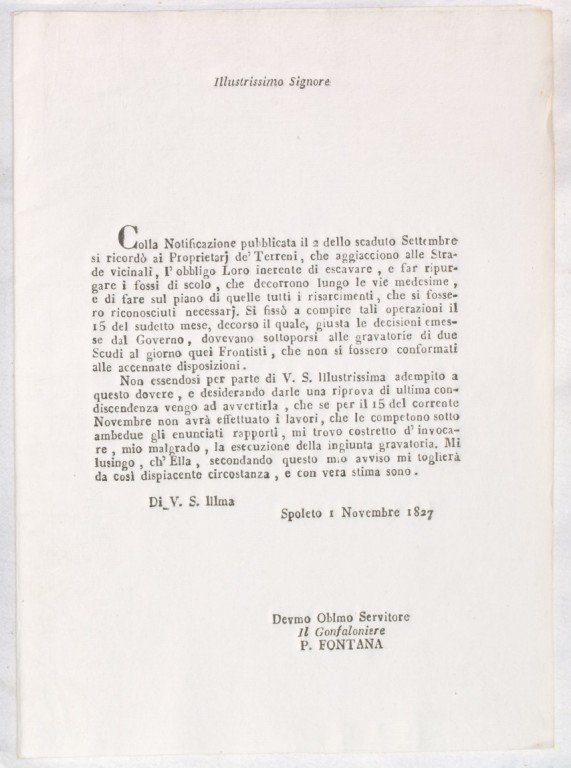 In 8. Dim. 27x19,5 cm. Pp. 4. Interessante notificazione su bella carta filigranata del 1827 nella quale il Gonfaloniere P. Fontana avvisava i cittadini di Spoleto con la casa di fronte alla strada di scavare e pulire i canali di scolo. In ottime condizioni. Interesting notification on markes paper of 1827 in which the Gonfaloniere of Spoleto Fontana communicated to the citizens of Spoleto living in front of the street that each one should escavate and clean the channel in front of his house. In very good conditions.
