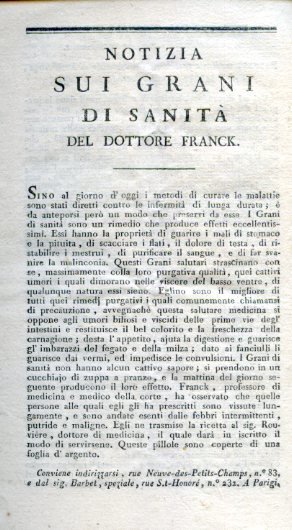 Notizia sui grani di sanità del dottore Franck | Libri antichi e moderni |