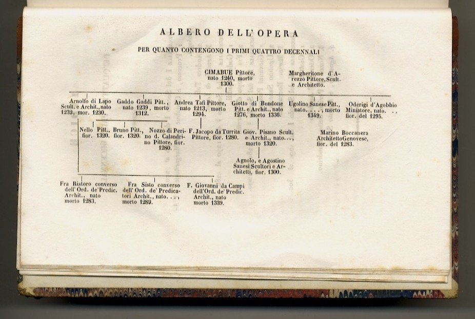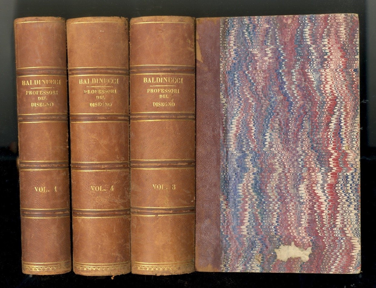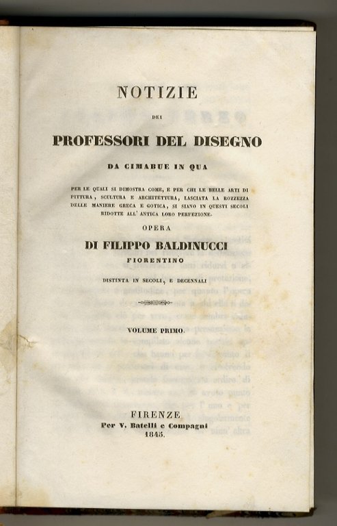 Firenze, per V. Batelli e Compagni, 1845-1846, volumi 3, in-8 grande, legatura ottocentesca in mezza pelle, dorsi a 4 nervi con titolo, numero di volume e filetti in oro, pp. 607, [1] - 758, [2], l'ultima c. bianca - 715, [1]. Con un albero genealogico tipografico ripiegato al primo volume. Una delle migliori edizioni dell'opera. Mancano i volumi secondo e quinto. Naturalmente le notizie sui pittori comprese nei tre volumi qui presenti sono complete.