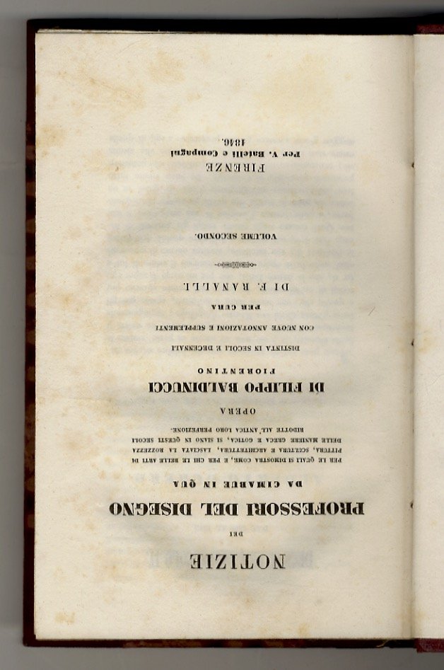 Firenze, per V. Batelli e Compagni, 1846, in-8, mezza tela moderna ed angoli, titolo e filettature oro al dorso, pp. 666. "Biblioteca dell'artista", VI. Questo volume (sui 5 dell'opera completa) copre il periodo dal 1500 al 1570. Condizioni ottime, salvo sporadiche fioriture.