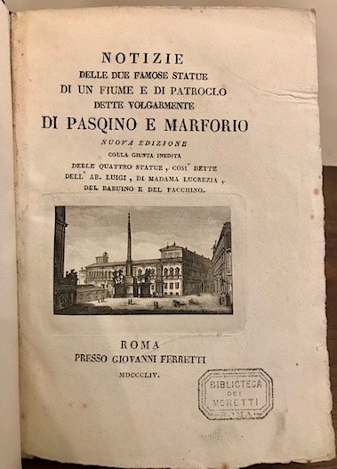 Notizie delle due famose statue di un fiume e di Patroclo dette volgarmente di Pasquino e Marforio. Nuova edizione colla giunta inedita delle quattro statue, così dette dell’Ab. Luigi, di Madama Lucrezia, del Babuino e del Facchino | Libri antichi e moderni | Cancellieri Francesco
