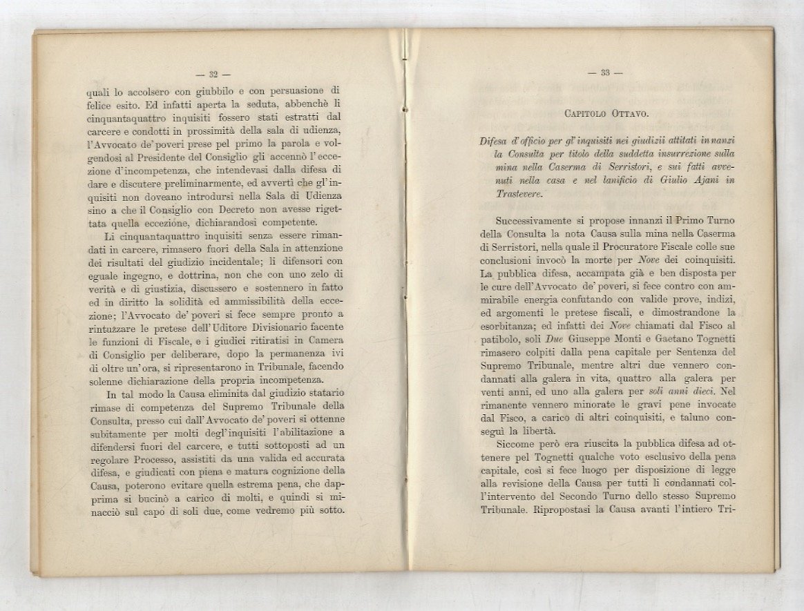 [Roma], [s.n.], [c. 1869], in-8, br. fittizia, pp. 53, [1]. Testo anonimo, pubblicato in difesa del difensore d'ufficio dei poveri nello Stato Pontificio, Nicola Annibaldi, estromesso dalla sua carica su sollecitazione della curia più oltranzista, per il fatto d'esser riuscito più volte ad evitare la pena di morte agli accusati di insurrezione. L'opuscolo è attribuibile all'ala più moderata dei cattolici.