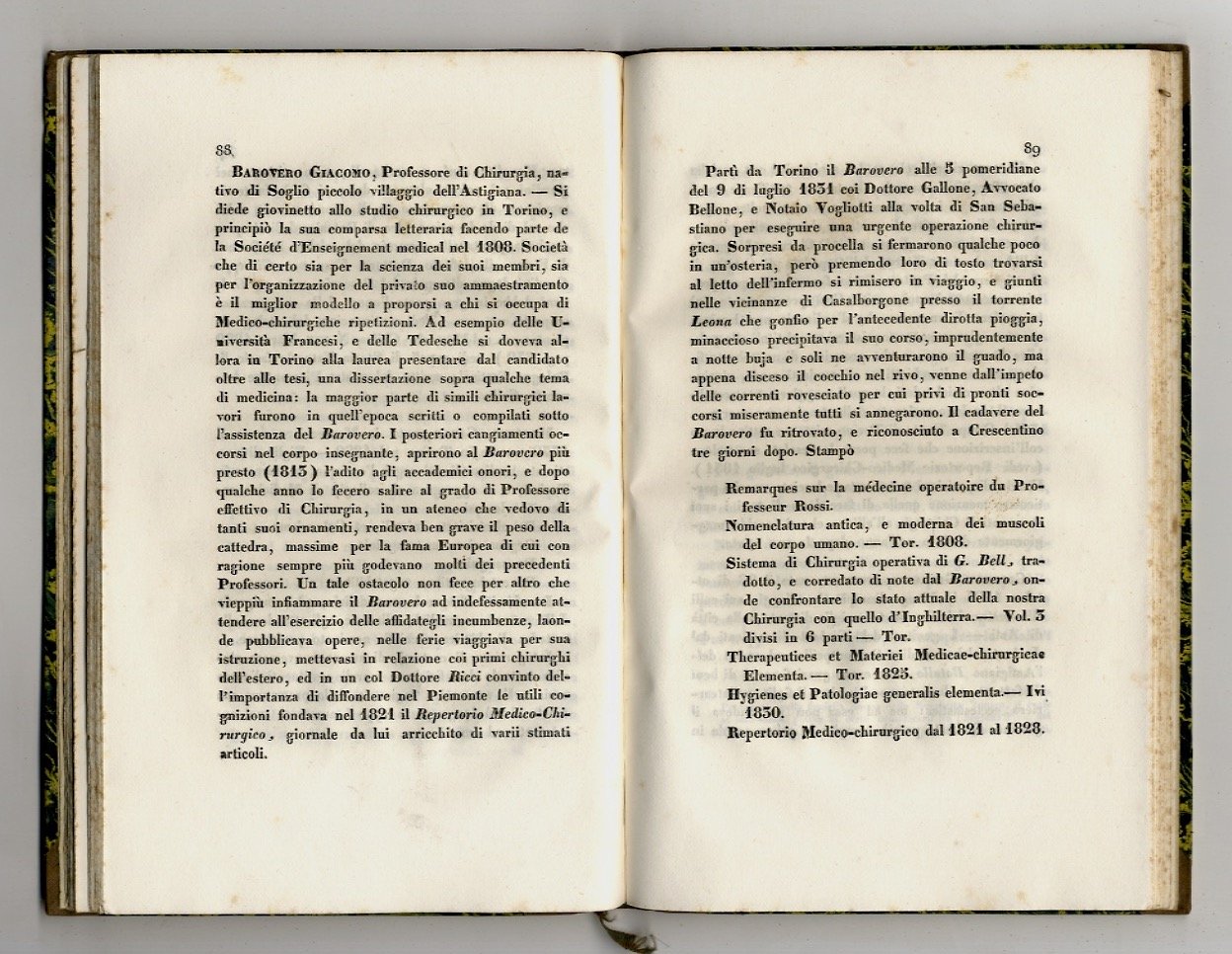 Asti, dalla Tipografia di Alessandro Garbiglia, 1839, in-8, mezza tela coeva ed angoli, titolo su cartello al dorso, piatti marmorizzati, nastrino, pp. 158, (2). Con ritratto a medaglione di Vittorio Alfieri inciso da L. Mecco in litografia (Lit. Doyen e C.) su tavola fuori testo, protetta da velina. Dedica a stampa dell'autore al marchese Cesare Alfieri di Sostegno, cugino di Vittorio e dotto bibliofilo. In fine: indice alfabetico dei 174 scrittori. Al foglio di guardia anteriore nota coeva (datata agosto 1843) vergata in minuta calligrafia: breve biografia dell'autore (Castell'Alfero 1793 - Torino 1848) che fu medico, divulgatore e filantropo, designato "Medico d'Onore" a Torino (e tratta da l'"Italia Scientifica contemporanea" di Ignazio Cantù). Edizione originale di questo ricco repertorio biografico dei protagonisti della vita culturale astigiana fino all'800. Ottime condizioni.