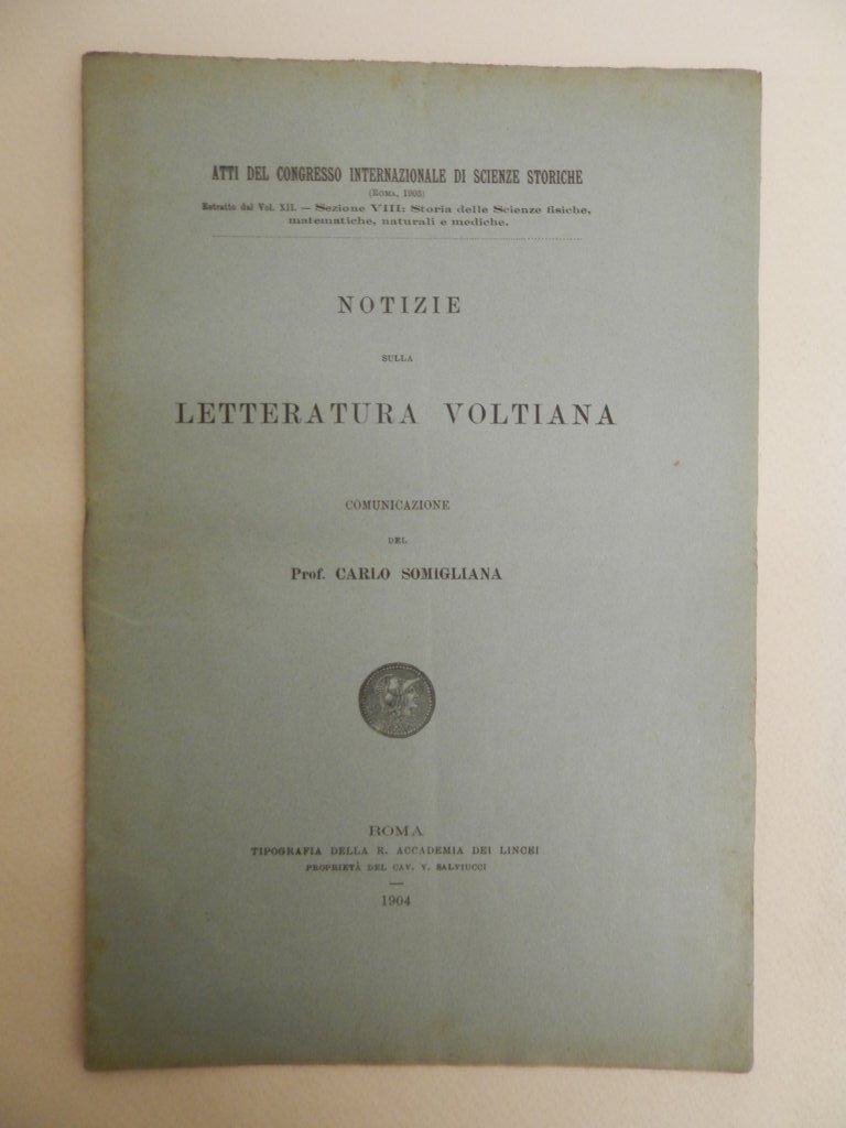 8^, pp. 15, brossura editoriale, titolo al piatto, estratto dagli atti del congresso internazionale di Scienze Storiche. Bibliografia esplicata sulle opere e gli articoli di Alessandro Volta. Piegatura da spedizione, esemplare molto buono. *** TUTTI I NOSTRI LIBRI SONO VISIBILI PREVIO CONTATTO MAIL O TELEFONO NELLA NUOVA SEDE DI MILANO: LIBRERIA COSMOPOLIS, VIA JOMMELLI, 22. ***