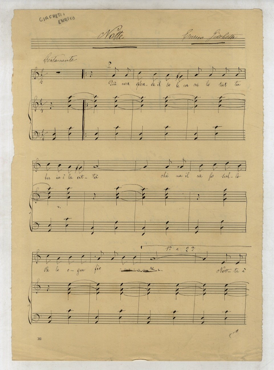 [S.l.], [s.n.], [anni '20 del'900], spartito manoscritto (autografo?), firmato; un foglio in 4 con musica notata e testo. Buone condizioni.