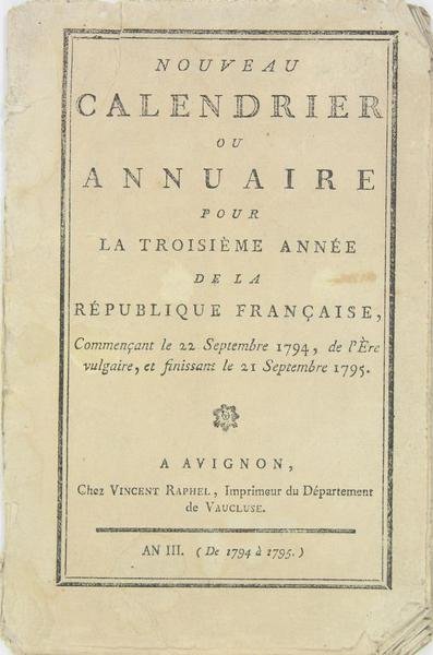 Avignon, an iii (1794 à 1795). Plaquette 19 x 12.5 cm, 12 feuillets imprimés : éclipses, annuaire, les “sanculottides” (le sixième jour des années sextiles, tous les quatre ans), 46 principes de morale et de politique, nouvelle division des jours et des heures. Coins cornés et auréole claire sur certains feuillets.