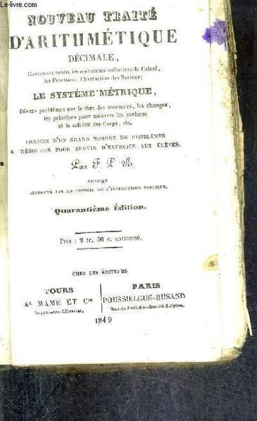 NOUVEAU TRAITE D'ARITHMETIQUE DECIMALE CONTENANT TOUTES LES OPERATIONS ORDINAIRES DU CALCUL LES FRACTIONS L'EXTRACTION DES RACINES LE SYSTEME METRIQUE DIVERS PROBLEMES SUR LE TITRE DES MONNAIES LES CHANGES LES PRINCIPES POUR MESURER LES SURFACES ETC.