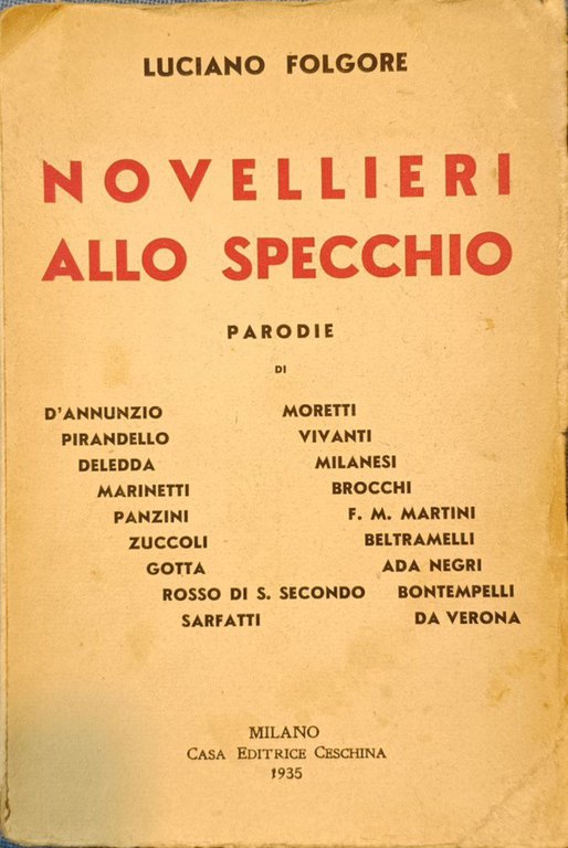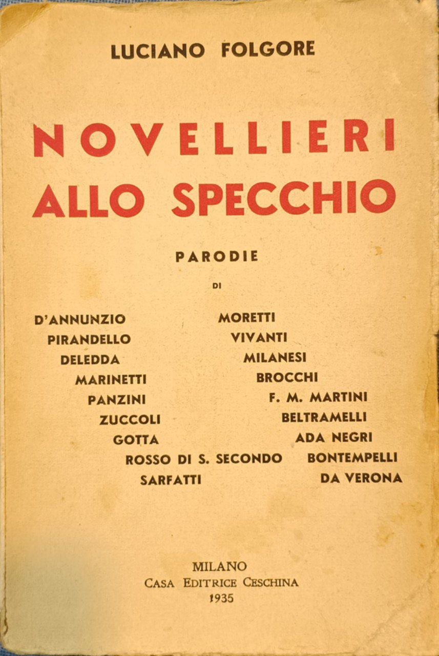 Novellieri allo specchio: parodie di D'Annunzio, Pirandello, Deledda, Marinetti, Panzini, Zuccoli, Gotta, Rosso di S. Secondo, Sarfatti, Moretti, Vivanti, Milanesi, Brocchi, F. M. Martini, Beltramelli, Ada Negri, Bontempelli, Da Verona