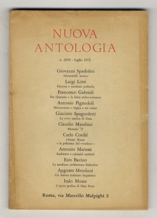 Roma, [s.n.], 1972, un fascicolo in-8, br. editoriale, pp. numerate da 304 a 448 + pagine pubblicitarie non numerate. Dall'indice segnaliamo: Giovanni Spadolini "Salvatorelli storico", Luigi Lotti "Elezioni e tendenze politiche", Calo Cordié "Ottone Rosai e le polemiche del verdone", ecc.