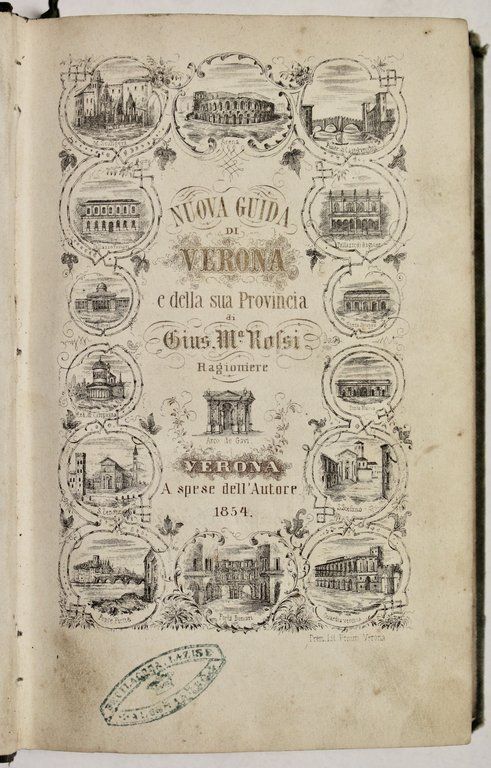 In 8°(mm 200x120), pagg. XIV, 335, 16. Frontespizio litografico eseguito da Penuti con 14 vedutine di Verona; tela editoriale coeva verde titolo e decori impressi in oro al dorso. Alla fine è aggiunta una pianta litografica di Verona di mm 460 x670, datata 1849 stampata a Rovigo da Minelli, normalmente inserita in Cagnoli "Cenni statistici di Verona e della sua provincia" ma non pertinente a questa opera, montata su tela in 24 stacchi. Buon esemplare con tracce d'uso alla tela aloni e piccole mancanze alle cuffie, internamente lievi fioriture. Piccolo timbro di collezione al frontespizio. <BR>