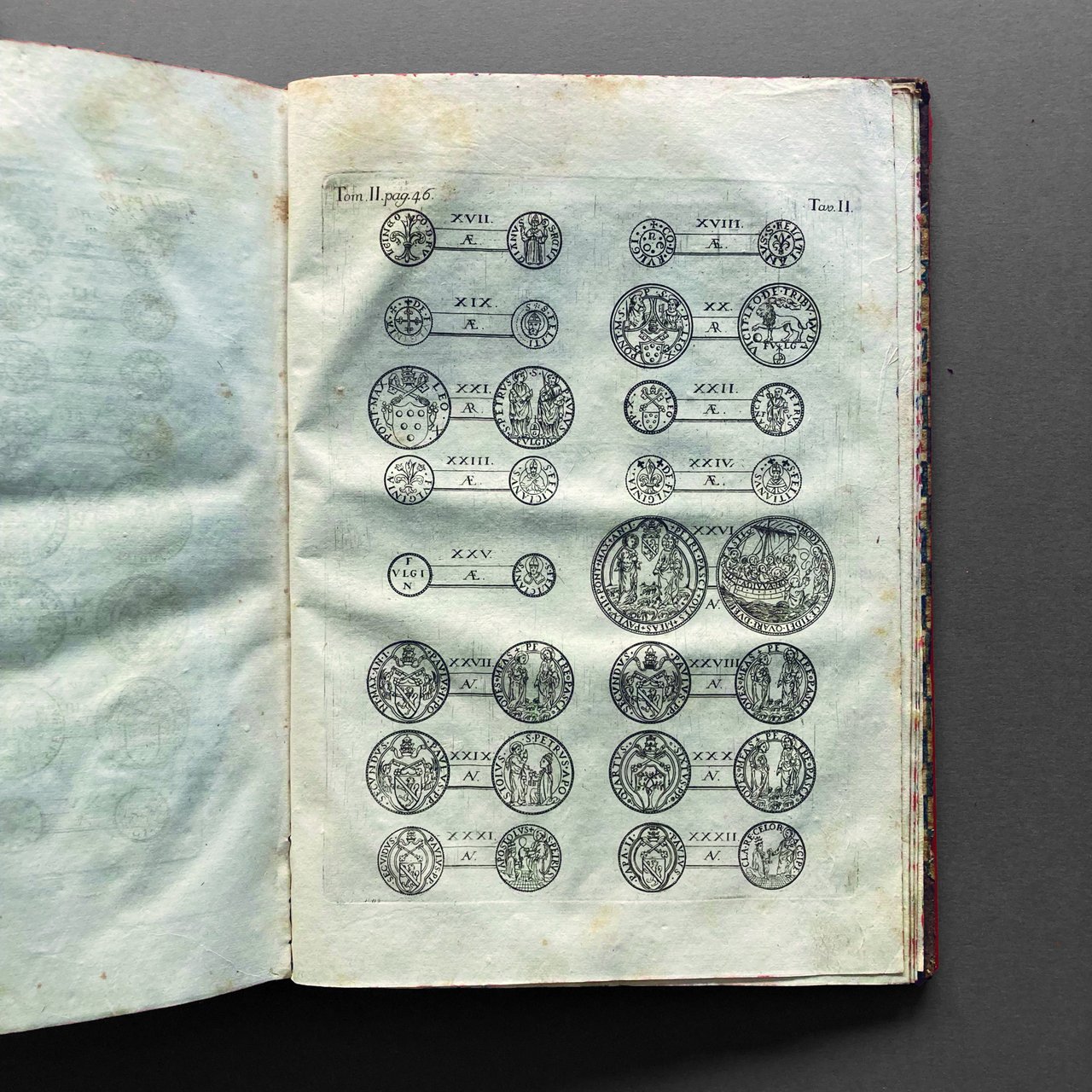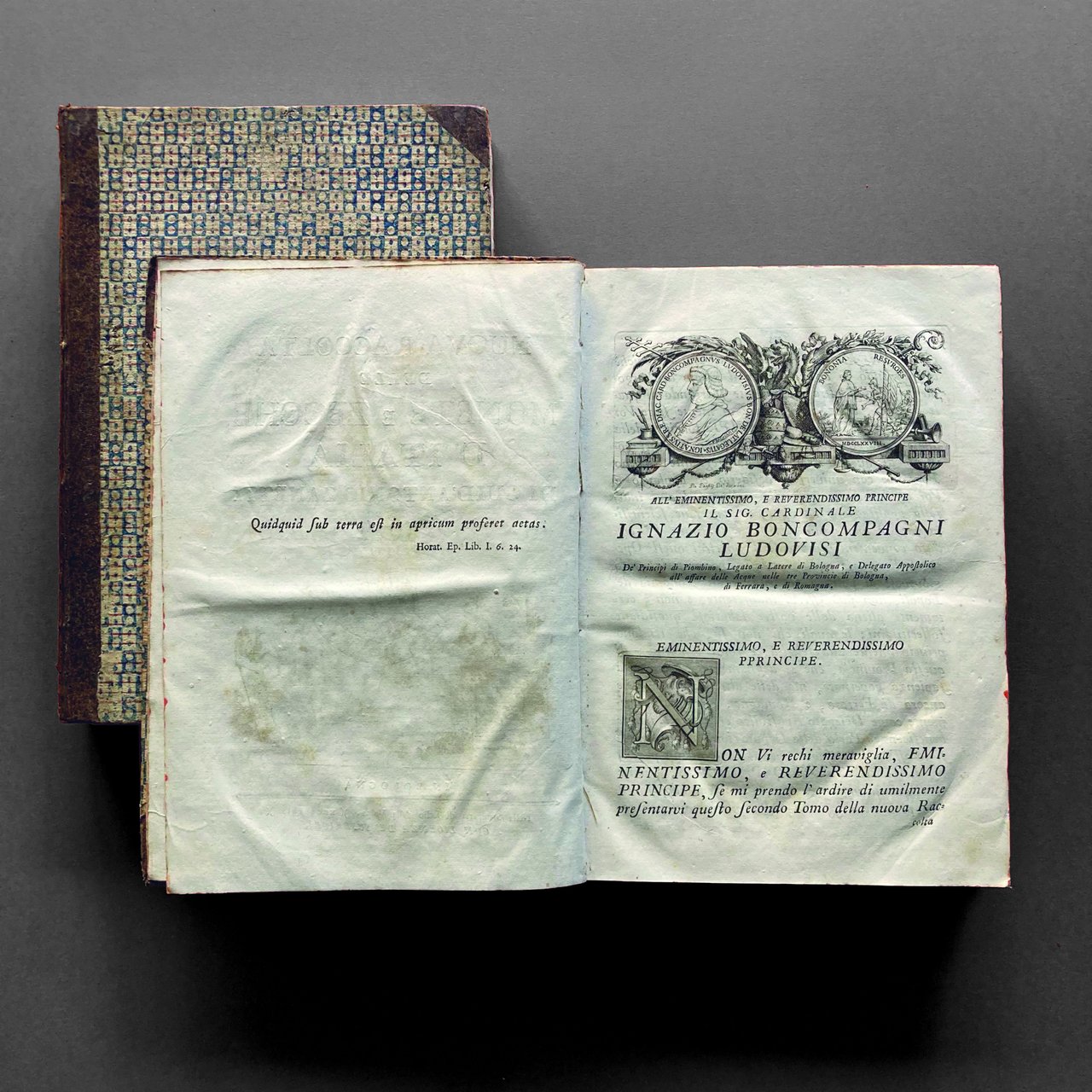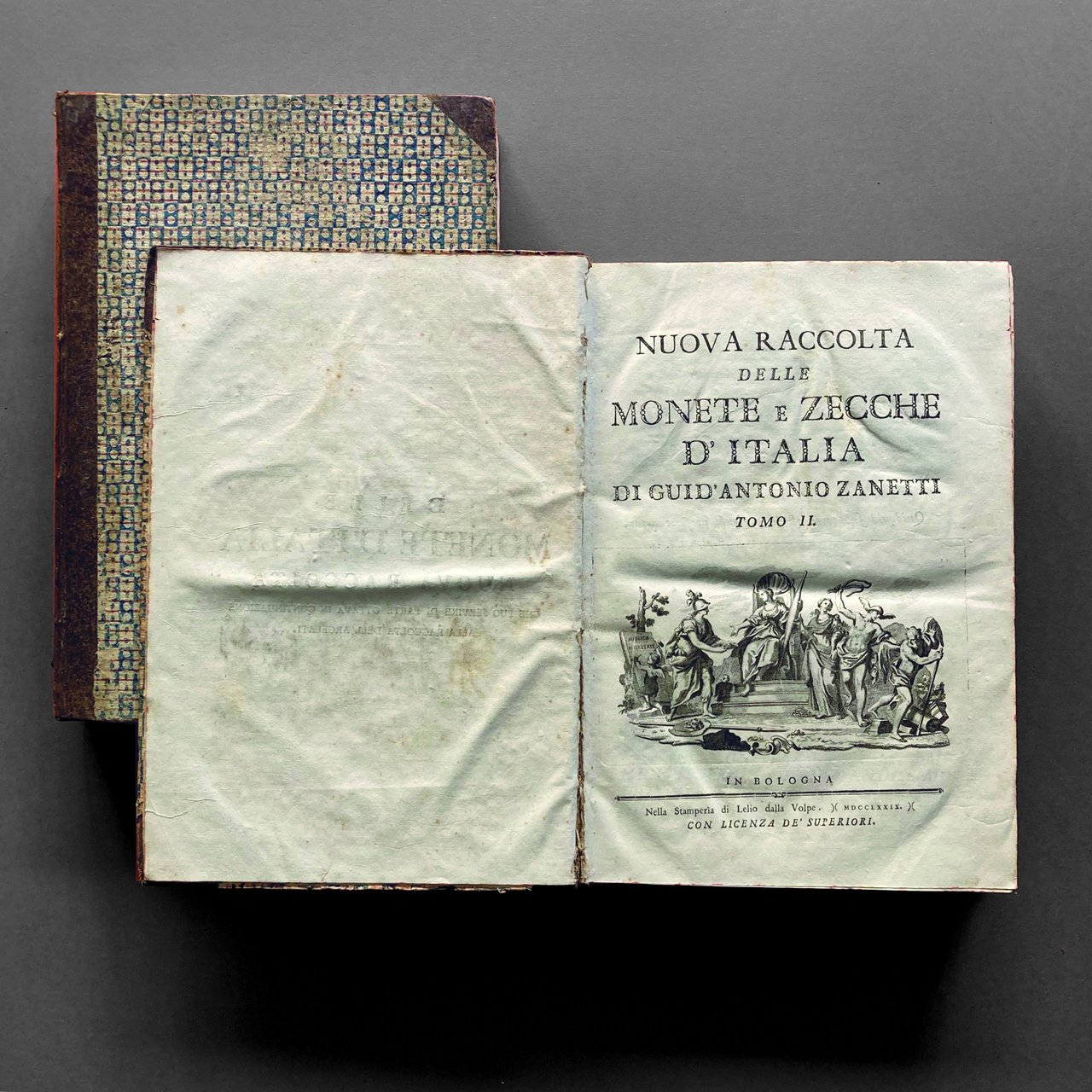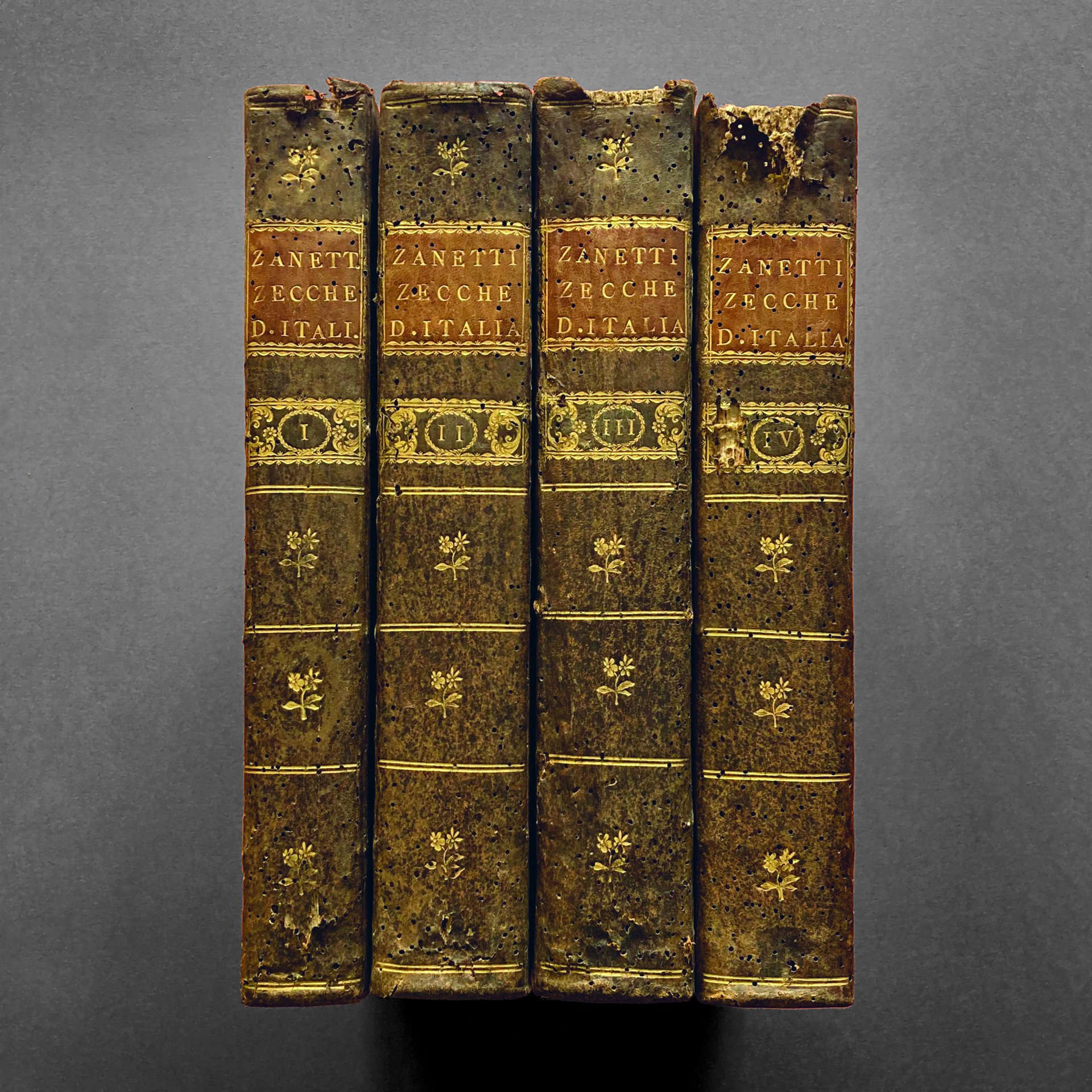 In folio, quattro volumi di pp. [8], XVI, 470, [2], con 3 tavole fuori testo; XXXX, 514, con 10 tavole fuori testo; pp. XVI, 508, con 26 tavole fuori testo; pp. XIV, 544, con 7 tavole fuori testo. Manca il quinto volume. Edizione originale, molto raro. Belle legature coeve in mezza pelle con piatti in carta decorata e titoli su tassello, dorsi decorati in oro, tagli a spruzzo. Esemplare fresco e genuino, completo delle tavole incise.