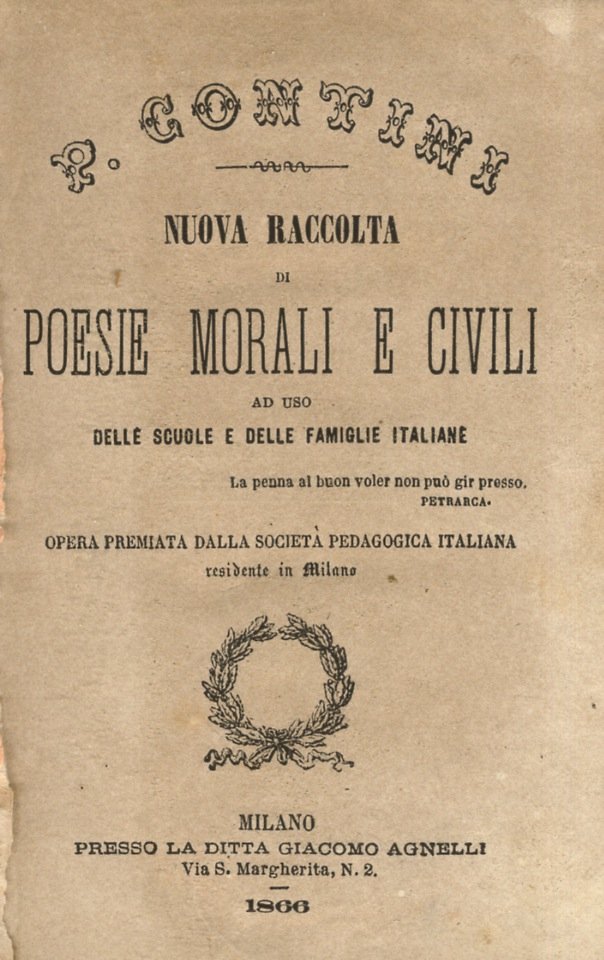 Nuova raccolta di poesie morali e civili. Ad uso delle scuole e delle famiglie italiane. (Ai Poeti italiani - Vittorio Emanuele - La battaglia di Varese - La Guardia Nazionale - I Martiri italiani - La Profuga Veneta - Il Romito di Caprera - La morte di Cavour - L'Italia alla Polonia.).