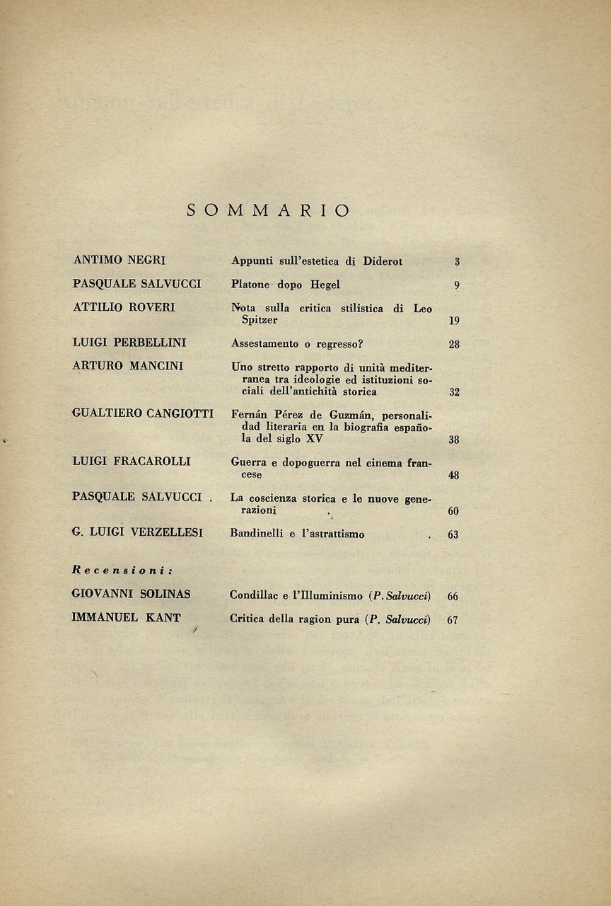 Verona, Editrice Libreria Dante, 1957, un fascicolo in-8, br. editoriale, pp. 68. Dall'indice: Antimo Negri "Appunti sull'estetica di Diderot", Pasquale Salvucci "Platone dopo Hegel", G. Cangiotti "Fernàn Pères de Guzman, personalidad literaria en la biografia espanola del siglo XV".