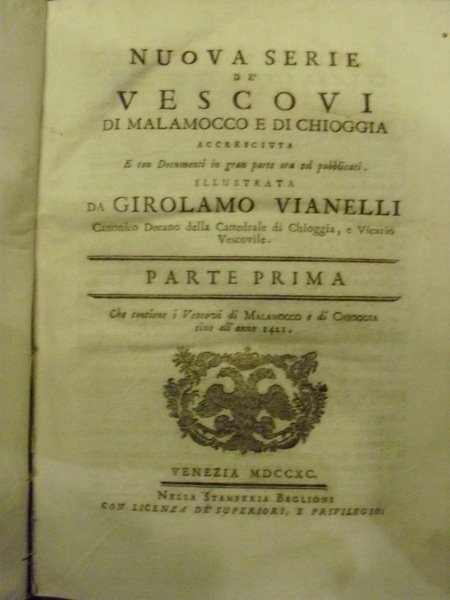 NUOVA SERIE DE' VESCOVI DI MALAMOCCO E DI CHIOGGIA ACCRESCIUTA E CON DOCUMENTI IN GRAN PARTE ORA SOL PUBLICATI VENEZIA, STAMPERIA BAGLIONI. 1790 1790