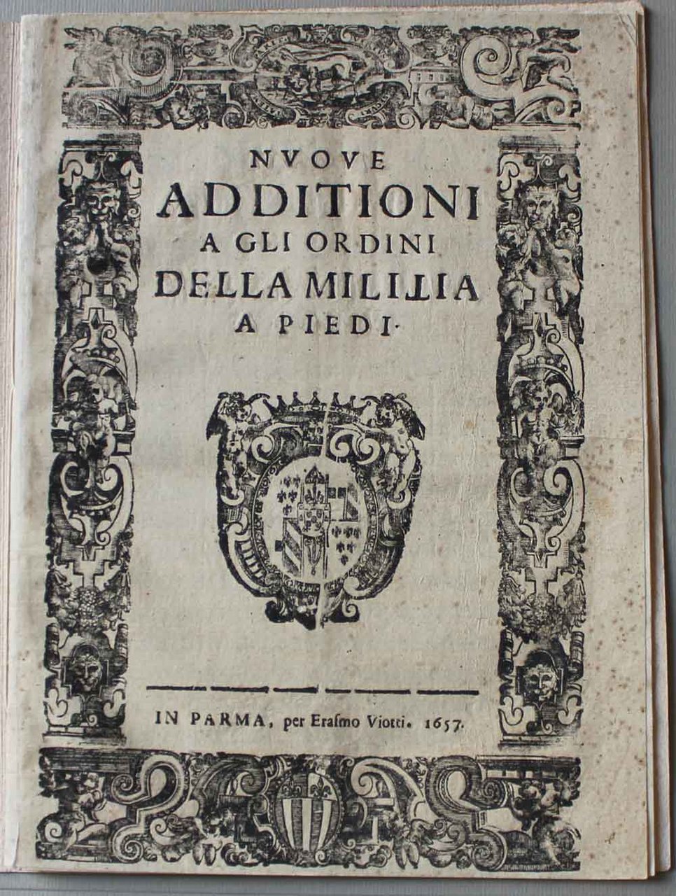 <p>in folio, (27x20) cm, protetto da cartella in cartone "alla rustica"; cc. (10), titolo e stemma di Parma racchiusi in ricca cornice barocca. Un po' rifilato, fregio e 2 grandi capiletera animati silografati. Esemplare molto buono, rara opera, nessun esemplare in ICCU</p>