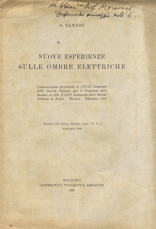 Bologna, Cooperativa tipografica Azzoguidi, 1929, in-8, br. editoriale, pp. [4]. Estratto da: Nuovo cimento, a. 6., n. 9, nov. 1929. Invio mansocritto dell'autore sulla copertina anteriore.