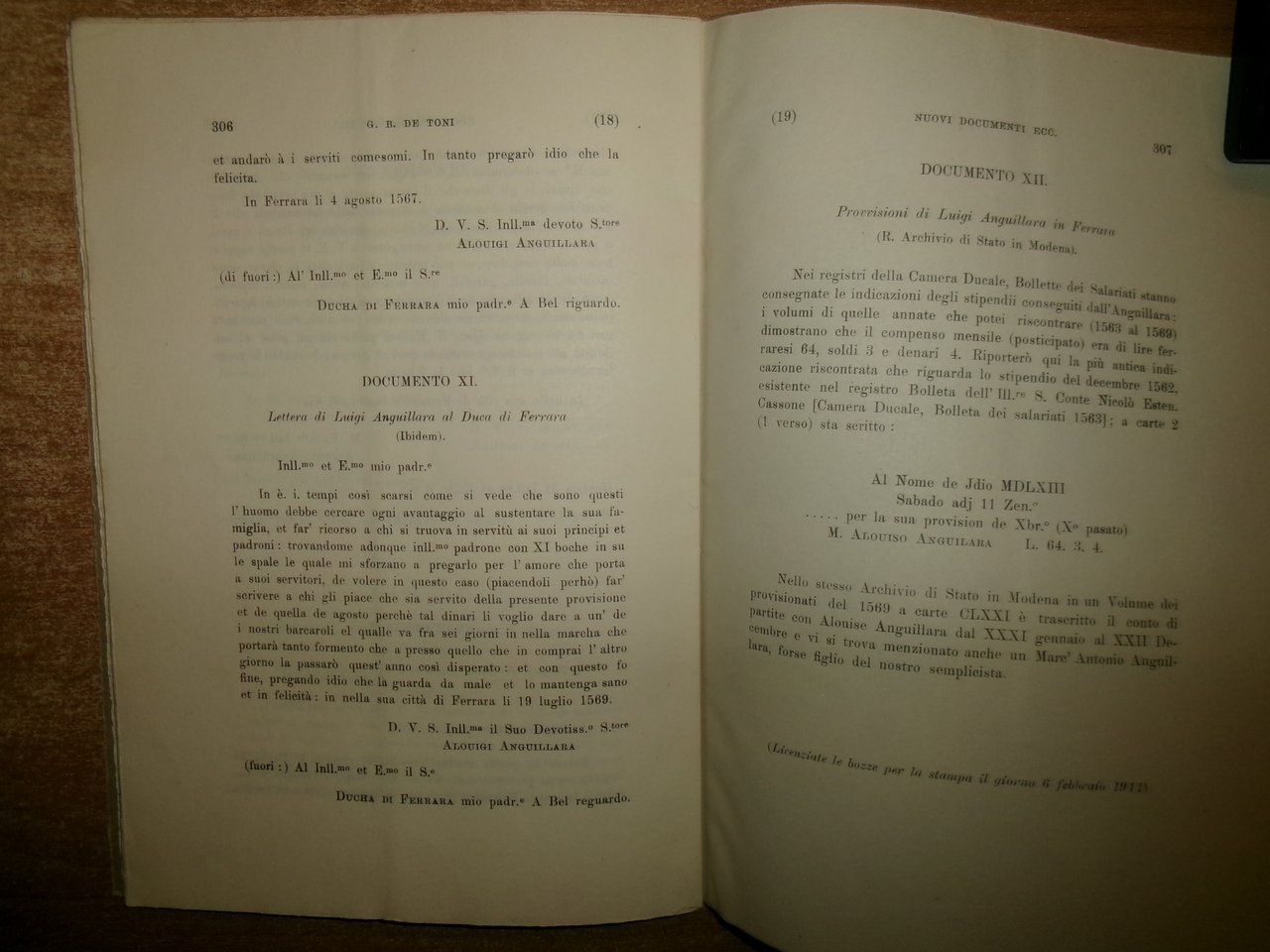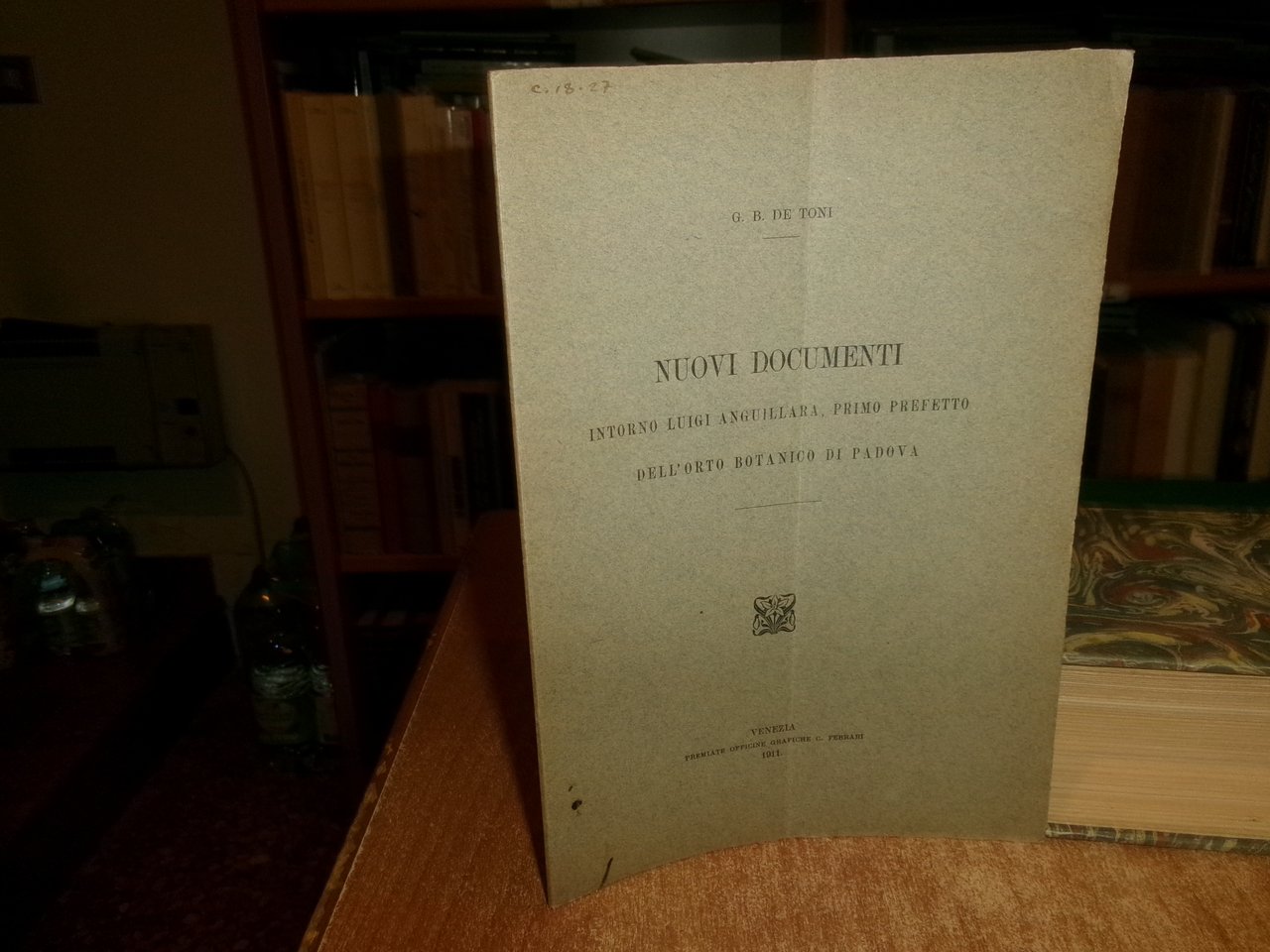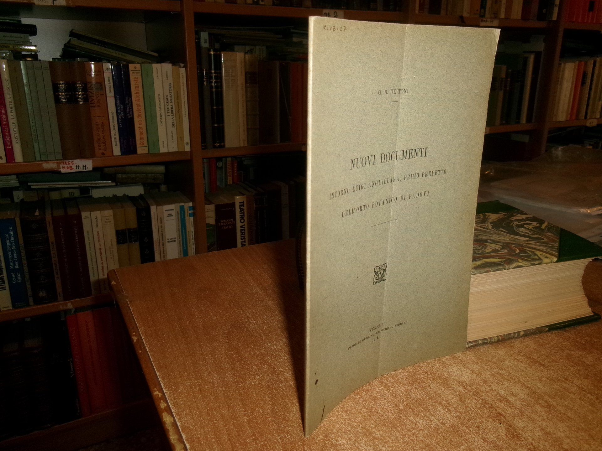 G. B. DE TONI. Venezia, Premiate Officine Grafiche C. Ferrari, 1911. NUOVI DOCUMENTI intorno LUIGI ANGUILLARA, Primo Prefetto dell' Orto Botanico di Padova. In-8°, br. orig. da pag. 288 a pag. 307. Estratto ottimamente conservato con dedica dell' Autore non firmata ad un amico professore. Neg. mob. 10 in busta.