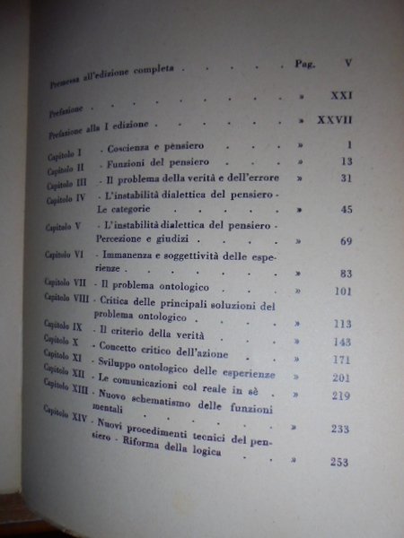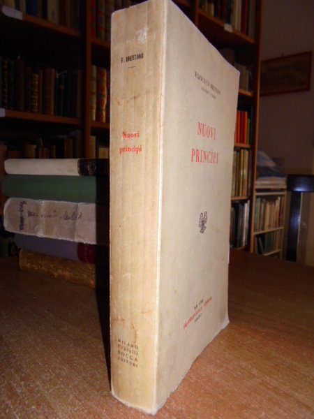 Nuovi Principi. Francesco, Orestano. Milano, Fratelli Bocca, 1939. In-8° picc., cart. edit. xlviii, 420, (2) pp. Molto ben conservato (intonso). Capitoli: coscienza e pensiero, funzioni del pensiero, problema della verità e dell'errore, l'instabilità dialettica del pensiero: le categorie - percezione e giudizi, immanenza e soggettività delle esperienze, problema ontologico, critica delle principali soluzioni del problema ontologico, criterio della verità, concetto critico dell'azione, sviluppo ontologico delle esperienze, comunicazioni col reale in sè, nuovo schematismo dele funzioni mentali, nuovi procedimenti tecnici del pensiero: riforma della logica - spazio-tempo e categorie, nuova teoria della scienza, mondo dei valori umani, processo storico collettivo, economia della vita, filosofia perenne. Neg. mob. 4