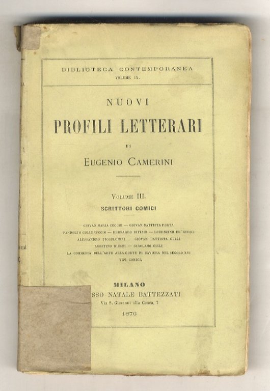 Nuovi profili letterari di Eugenio Camerini. Vol. III: Scrittori comici: Giovan Maria Cecchi, Giovan Battista Porta, Pandolfo Collenuccio, Bernardo Divizio, Lorenzino de' Medici, Alessandro Piccolomini, Giovan Battista Gelli, Agostino Ricchi, Girolamo Gigli, La commedia dell'arte alla corte di Baviera nel secolo XVI, i tipi comici.