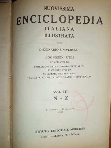 AA. VV. Milano, Istituto Editoriale Moderno, 1936. DIZIONARIO UNIVERSALE DI COGNIZIONI UTILI COMPILATO DA PROFESSORI DELLE SINGOLE SPECIALITÀ E CORREDATO DA NUMEROSE ILLUSTRAZIONI TAVOLE A COLORI E FOTOGRAFIE IN ROTOCALCO. PRIMA EDIZIONE, SECONDA RISTAMPA. 3 VOLUMI IN - 8°, BELLA LEGATURA IN M. TELA, COMPLESSIVE 2276 PP. CON NUMEROSE TAVOLE F.T. E MOLTISSIME ILLUSTRAZIONI N.T. IN OTTIMO STATO DI CONSERVAZIONE. Neg. UTET