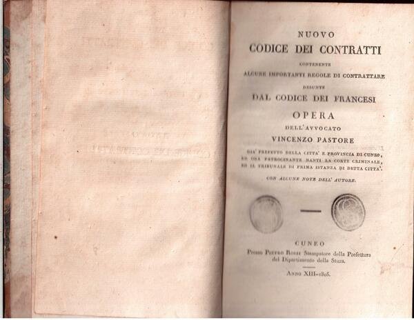 Nuovo codice dei contratti contenente alcune importanti regole di contrattare desunte dal codice dei francesi Opera dell'avvocato Vincenzo Pastore già prefetto della città e provincia di Cuneo,ed ora patrocinante nanti la corte criminale,ed il tribunale di prima istanza di detta città