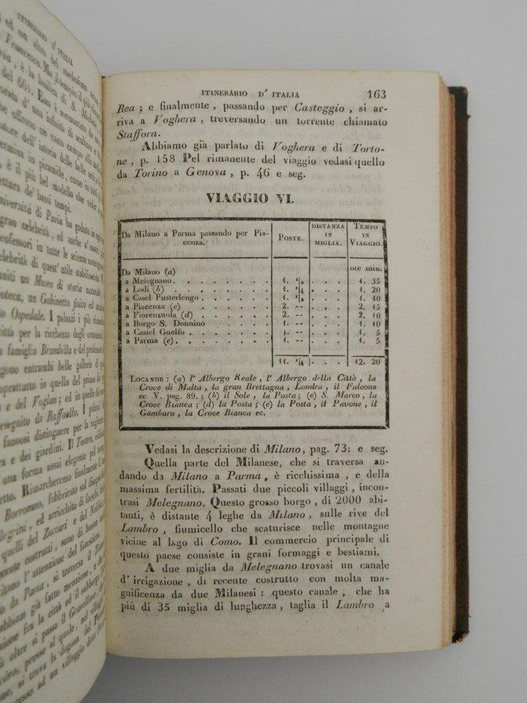 8°, 20 cm, pp. X, 450, rilegatura coeva in mezza pelle, piatti in tela, titolo e fregi a secco al dorso, alcune tabelle con i prezzi dei viaggi e la distanza in miglia dalle città descritte. Esemplare molto buono, leggere bruniture dovute alla qualità della carta. Tavola dei viaggi: Passaggi delle Alpi che conducono in Italia; Italia settentrionale, Italia centrale, Italia meridionale; supplemento. Veloce descrizione delle città più importanti. *** TUTTI I NOSTRI LIBRI SONO VISIBILI PREVIO CONTATTO MAIL O TELEFONO NELLA NUOVA SEDE DI MILANO: LIBRERIA COSMOPOLIS, VIA JOMMELLI, 22. ***