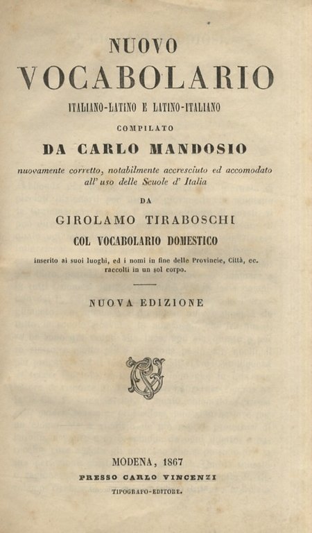 Nuovo vocabolario italiano-latino e latino-italiano (.) nuovamente corretto, notabilmente accresciuto ed accomodato all'uso delle Scuole d'Italia da Girolamo Tiraboschi. Col vocabolario domestico inserito ai suoi luoghi, ed i nomi in fine delle Province, Città, ec. raccolti in un sol corpo. Nuova edizione.