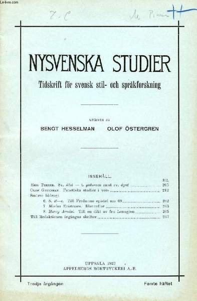NYSVENSKA STUDIER, TREDJE �RG�NGEN 1923, FEMTE H�FTET, TIDSKRIFT F�R SVENSK STIL- OCH SPR�KFORSKNING (Inneh�ll: Erik Terner. Sv. d�st - t. gedunsen samt sv. dynt Olof G-jerdman. Fonetiska studier i vers.Sm�rre bidrag:6. S. ?�e. Till Fredmans epistel.)