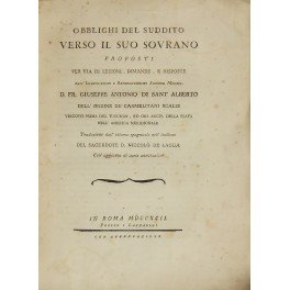 Obblighi del suddito verso il suo sovrano proposti per via di lezioni dimande e risposte dall'Illustrissimo e Reverendissimo Signore Monsig. D. Fr. Giuseppe Antonio di Sant'Alberto. Traduzione dall'idioma spagnuolo nell'italiano del sacerdote D. Niccolò de Lagua. Coll'aggiunta di varie annotazioni