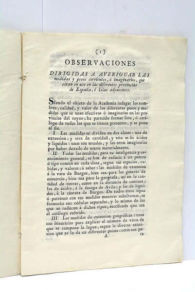OBSERVACIONES DIRIGIDAS a averiguar las medidas y pesos corrientes, ó imaginarios, que estan en uso en las diferentes provincias de España, é Islas adyacentes.