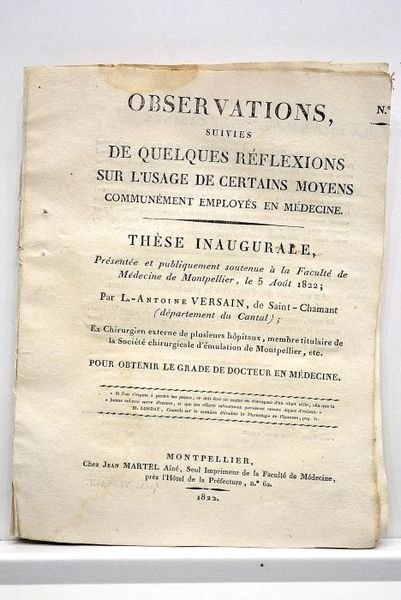 Observations suivies de quelques réflexions sur l'usage de certains moyens communément employés en médecine. Thèse inaugurale présentée et publiquement soutenue à la Faculté de Médecine de Montpellier, le 5 août 1822.
