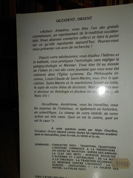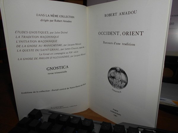 ROBERT AMADOU. Paris, Cariscript, 1987. OCCIDENT, ORIENT. Parcours d' une tradition. In-8°, br. 135 pp. con alcune ill. in nero n.t. Come nuovo. Uff. stanzetta mob. piccolo a destra